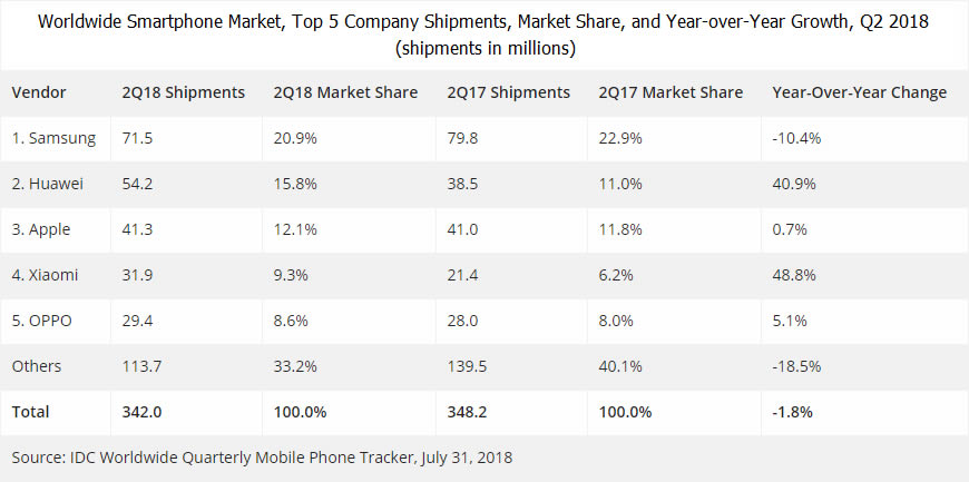 IDC (International Data Corporation) รายงานยอดจัดส่งและส่วนแบ่งตลาดของสมาร์ทโฟนทั่วโลก ในไตรมาสที่ 2 ปี 2018 (1 เมษายน – 30 มิถุนายน) โดยพบว่ายอดจัดส่งสมาร์ทโฟนทั้งหมดอยู่ที่ 342 ล้านเครื่อง ลดลง 1.8% เมื่อเทียบกับไตรมาสเดียวกันของปี 2017 ซึ่งมียอดจัดส่ง 348.2 ล้านเครื่อง