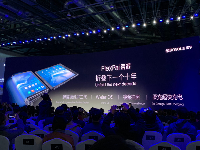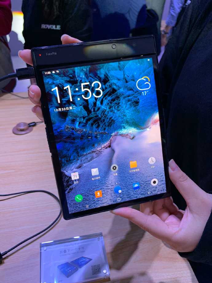 Royole เป็นผู้ผลิตรายแรกของโลก ที่เปิดตัวอุปกรณ์พับได้อย่างทางการ เรียกว่า FlexPai เป็นทั้งสมาร์ทโฟนและแท็บเล็ต โดยใช้จอแสดงผล AMOLED สามารถกางออกได้ 180 องศา เมื่อกางออกจนสุดจะมีขนาด 7.8 นิ้ว ความละเอียด 1920 x 1440 พิกเซล อัตราส่วนภาพ 4:3 มีความบาง 7.6 มิลลิเมตร เมื่อพับเข้าหากันจะมีความหนา 15.2 มิลลิเมตร บานพับผ่านการทดสอบ 200,000 ครั้ง