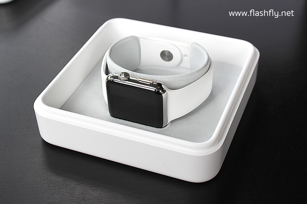เมื่อเปิดออกมาก็จะพบกับ Apple Watch รุ่นตัวเรือนสแตนเลสสตีลสาย Sport Band สีขาวสวยงามอยู่ในลักษณะนี้ ด้านในกล่องพลาสสิกจะคล้ายกำมะหยี่ดูหรูหราสวยงามมีโลโก้ Apple Watch ที่ฝาด้านบนอีกด้วย