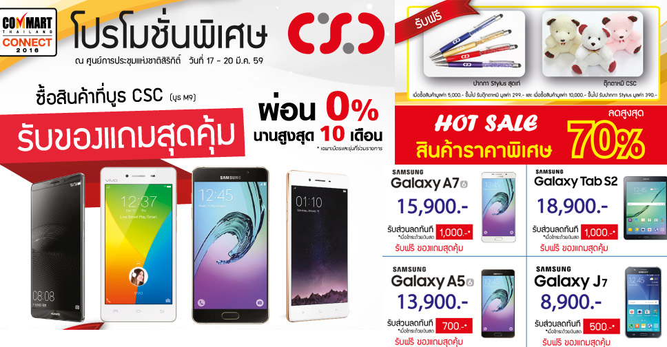 ห้ามพลาด! กับโปรโมชั่นสุดพิเศษจากบูธ CSC (M5, M9/1) ที่งาน Commart Connect 2016 ณ.ศูนย์ประชุมแห่งชาติสิริกิติ์ วันที่ 17 – 20 มีนาคม นี้ พบสินค้าดีมีคุณภาพไม่ว่าจะเป็นสินค้าไอที และมือถือ Smart Phone ในราคาสุดพิเศษพร้อมของแถมจัดเต็ม ทราบอย่างนี้แล้ว พบกันได้ที่บูธ CSC