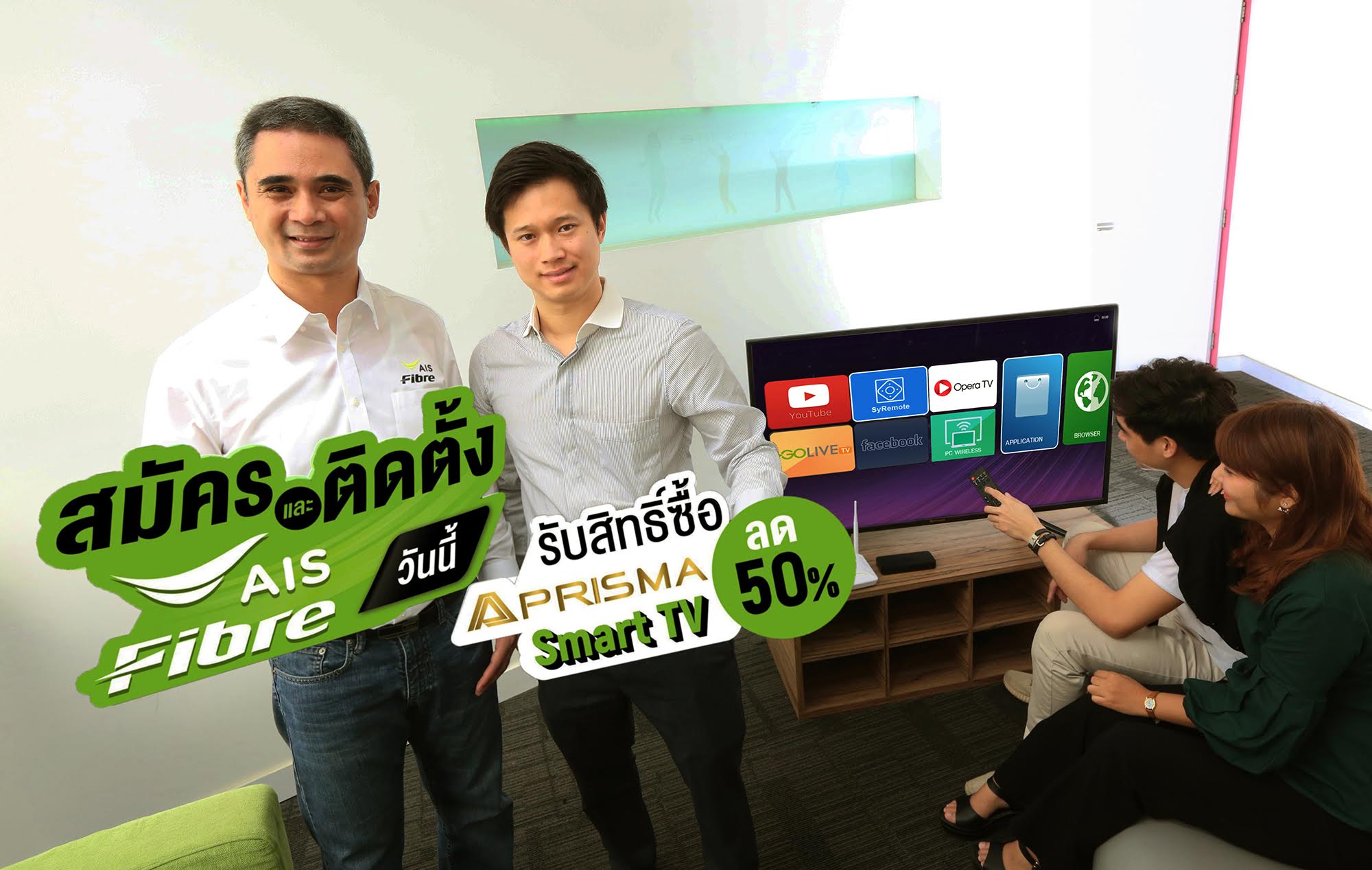 · เอไอเอส ไฟเบอร์ เปิดมิติใหม่การทำตลาดเน็ตบ้าน ขยายความร่วมมือสู่ธุรกิจสมาร์ททีวี เป็นครั้งแรก โดยจับมือ “ทรีวิว” ผู้ผลิตและส่งออกโทรทัศน์โออีเอ็มในประเทศไทย สร้างแคมเปญการตลาดที่แตกต่าง ขยายความสุขให้บ้านยุคใหม่ ตอบ Insight ลูกค้าเน็ตบ้าน ให้ใช้งานอินเทอร์เน็ตความเร็วสูง สนุกกับคอนเทนต์และความบันเทิงบนโลกออนไลน์แบบไร้ขีดจำกัด บนสมาร์ททีวีสุดล้ำ โดยมอบสิทธิพิเศษสำหรับลูกค้าใหม่ เอไอเอส ไฟเบอร์ ที่สมัครใช้แพ็กเกจใดก็ได้ทุกแพ็กเกจ รับส่วนลดซื้อ พริสม่า สมาร์ททีวี ในราคาพิเศษ เพียง 50% หรือลดสูงสุดถึง 11,490 บาท (สำหรับสมาร์ททีวี ขนาด 50 นิ้ว)