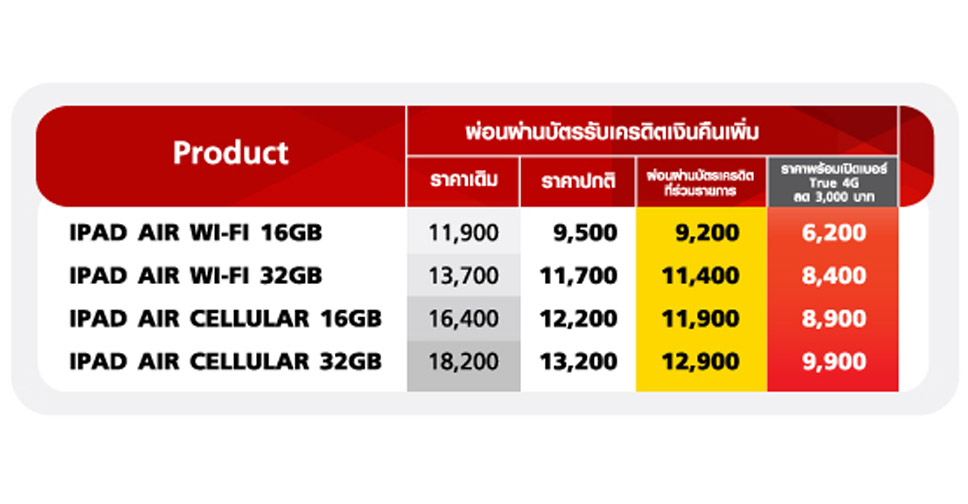 - iPad Air Cellular 16 GB ราคาพร้อมเเพ็คเกจ 8,900 บาท เมื่อสมัครเเพ็คเกจทรู 699 บาทขึ้นไป