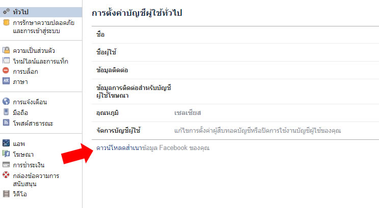 ถ้าหากคุณมีข้อมูลส่วนตัวอย่างรูปภาพหรือวีดีโอที่เคยแชร์และอยากเก็บเอาไว้ สามารถเข้าไปดาวน์โหลดข้อมูลเหล่านั้นได้ที่การตั้งค่าทั่วไป และคลิกที่ ดาวน์โหลดสำเนาข้อมูล Facebook ของคุณ (ตามรูปภาพด้านล่าง)
