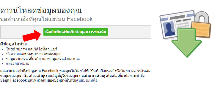 ในหน้าถัดไปคลิปปุ่มสีเขียว เพื่อเริ่มดาวน์โหลดข้อมูล คุณต้องใส่รหัส Facebbok ก่อนเริ่มดาวน์โหลดด้วย ถ้าหากคุณคิดว่าข้อมูลใน Facebook ไม่มีความจำเป็นต้องเก็บเอาไว้ ก็สามารถข้ามขั้นตอนนี้ได้