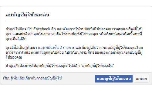 เมื่อพร้อมแล้วที่จะลาออกจากการเป็นสมาชิก Facebook คุณสามารถลบบัญชีได้โดยการคลิกที่ Link นี้ (Facebook ไม่มีปุ่มลบบัญชี มีแต่ปุ่มปิดการใช้งานชั่วคราว) จากนั้นกดปุ่มลบบัญชีผู้ใช้ของฉัน