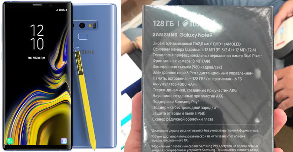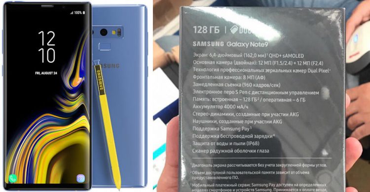 กล่องบรรจุภัณฑ์ของ Samsung Galaxy Note 9 สำหรับเตรียมวางจำหน่ายในรัสเซียถูกแชร์ออกมาก่อนเปิดตัว เผยให้เห็นสเปกข้างกล่องอย่างชัดเจน โดยยืนยันว่าปากกา S Pen จะสามารถใช้งานเป็นรีโมทได้ ตามที่เคยมีข่าวลือออกมาก่อนหน้านี้ อาจใช้กดเพื่อสั่งถ่ายภาพ และอาจใช้เล็งหรือยิงปืนในเกมได้อีกด้วย