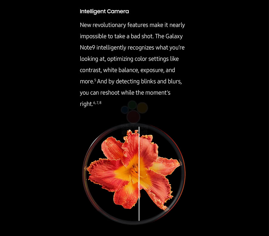 ภาพหลุดชุดใหม่ยังอ้างว่า กล้องของ Galaxy Note 9 จะมีฟีเจอร์ AI ระบุภาพที่จะถ่ายได้ เพื่อช่วยปรับค่ากล้องทั้งเรื่องของสีสัน, คอนทราส, สมดุลสีขาว, ชดเชยแสง แฃะ อื่นๆ รวมถึงตรวจจับการกระพริบตา หรือภาพเบลอ เพื่อให้ถ่ายใหม่ได้ทันที
