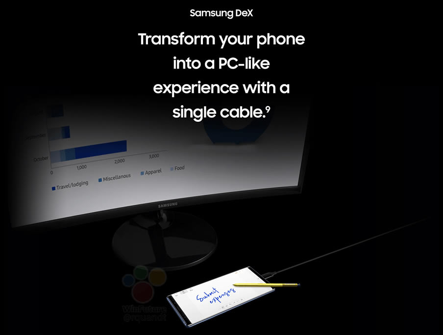 นอกจากนี้ Samsung Galaxy Note 9 จะสามารถเชื่อมต่อกับจอภาพภายนอกด้วยสายเคเบิลเพียงเส้นเดียว โดยไม่ต้องถึ่งพาอุปกรณ์เสริม Samsung DeX (คาดว่าจะใช้ HDMI adapter เหมือนกับ Galaxy Tab S4)