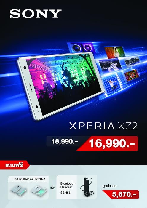 สมาร์ทโฟนเรือธงประจำปีนี้ของโซนี่ นำทัพโดย Xperia™ XZ2 Premium (27,990 บาท) โดดเด่นด้วยเทคโนโลยีสุดยอดกล้องทั้งการถ่ายภาพนิ่งและวีดีโอ โดยเป็นสมาร์ทโฟนรุ่นแรกของโลกที่ใช้กล้องระบบ Motion Eye™ Dual Camera สามารถบันทึกวีดีโอได้ด้วยความไวแสงสูงสุดที่ ISO12800 และถ่ายภาพนิ่งได้ที่ ISO51200 เมื่อซื้อในงาน รับฟรี ชุดหูฟังบลูธูท Bluetooth Headset SBH56 มูลค่า 2,990บาท อีกหนึ่งรุ่นเด่นคือ Xperia™ XZ2 สมาร์ทโฟนที่อัดแน่นด้วยเทคโนโลยีเพื่อความบันเทิงเต็มรูปแบบ ซึ่งออกแบบภายใต้คอนเซ็ปต์ “Entertainment to the Extreme” ขับเคลื่อนด้วยซีพียูที่เร็วและแรงที่สุดอย่าง Qualcomm® Snapdragon™ 845 ราคาพิเศษจาก 18,990 เหลือเพียง 16,990 บาทเท่านั้น พร้อมรับฟรี เคสสวยหรู Style Cover Touch และชุดหูฟังบลูธูท Bluetooth Headset SBH56 มูลค่า 5,760 บาท และพบกับรุ่นแฟล็กชิปจากปีที่ผ่านมาอย่าง Xperia™ XZ Premium สมาร์ทโฟนหน้าจอ 4K HDR รุ่นแรกของโลกขนาด 5.5 นิ้ว สุดยอดด้วยกล้อง Motion Eye™ และฟังก์ชั่นการถ่ายวีดีโอ Super Slow Motion 960fps นำมาลดแบบคุ้มสุดๆ เหลือเพียง 13,990 บาท พร้อมรับฟรี หูฟังบลูธูท Bluetooth Headset SBH56 มูลค่า 2,990 บาท นอกจากนี้ ยังมี Xperia™ XA2 Ultra สมาร์ทโฟนที่ล้ำหน้าด้วยกล้องหน้าเลนส์คู่มุมมอง Super wide-angle ถึง 120° ให้คุณได้ภาพเซลฟี่ที่สว่างสดใสในทุกสภาพแสง แถมเก็บภาพเพื่อนได้ยกแก๊งและวิวด้านหลังแบบเต็มซีน เสนอในราคาเพียง 9,990 บาท และรับฟรีชุดหูฟังบลูธูท Bluetooth Headset SBH24 มูลค่า 1,990 บาท และสมาร์ทโฟนรุ่นน้องประสิทธิภาพสูงราคาประหยัดอย่าง Xperia™ XA1 Plus เสนอในราคา 5,900 บาท พร้อมรับฟรี Xperia Mug มูลค่า 790 บาท