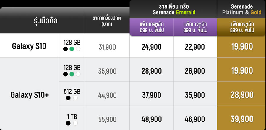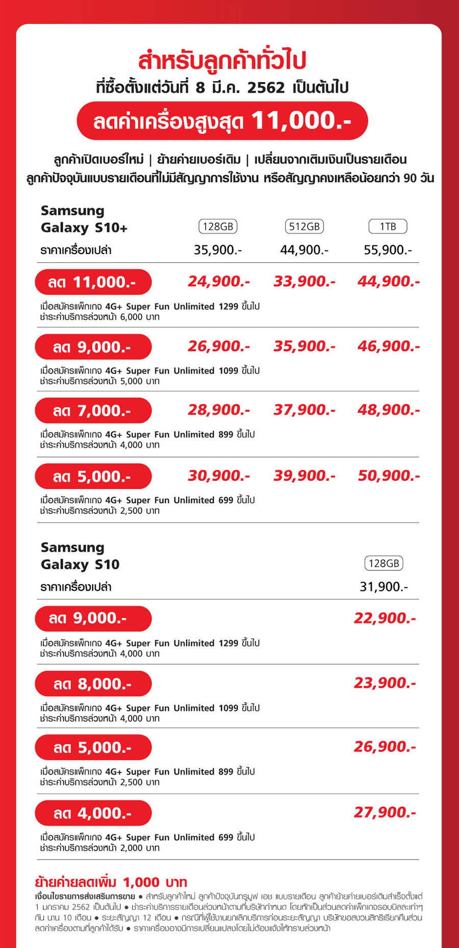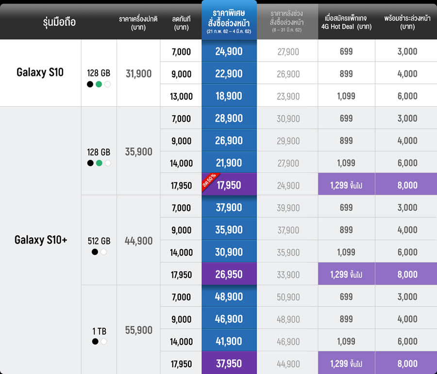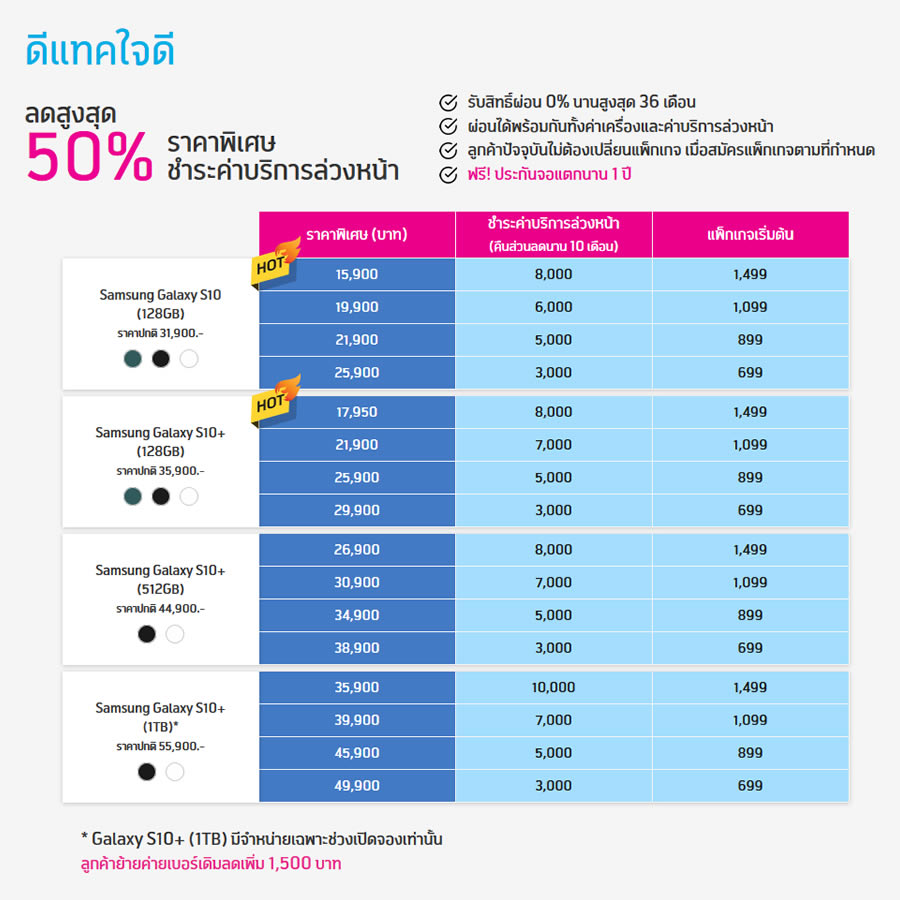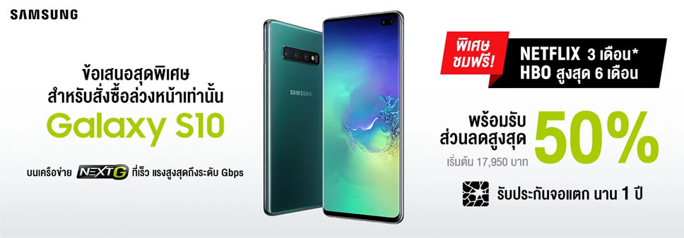 ผู้ให้บริการเครือข่ายโทรศัพท์เคลื่อนที่ทั้ง 3 รายในประเทศไทย พร้อมเปิดรับจองสมาร์ทโฟน Samsung Galaxy S10 และ Galaxy S10+ อย่างทางการแล้ว ตั้งแต่วันนี้ ไปจนถึงวันที่ 4 มีนาคม 2562 โดยผู้ที่สั่งจองในช่วงเวลาดังกล่าว จะได้รับประกันจอแตก นาน 1 ปี และได้ส่วนลดสูงสุด 50% ภายใต้เงื่อนไขที่แต่ละบริษัทฯ กำหนด