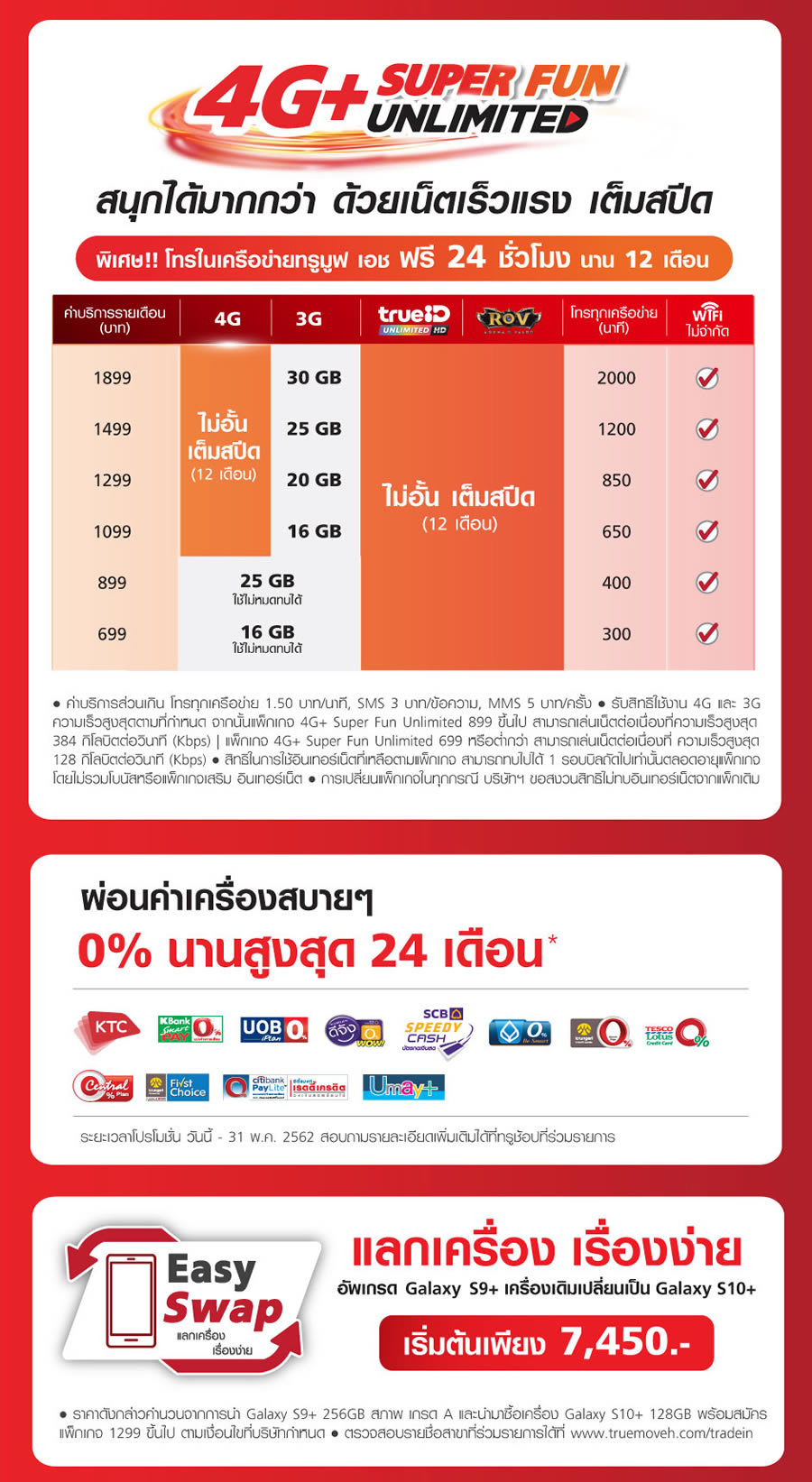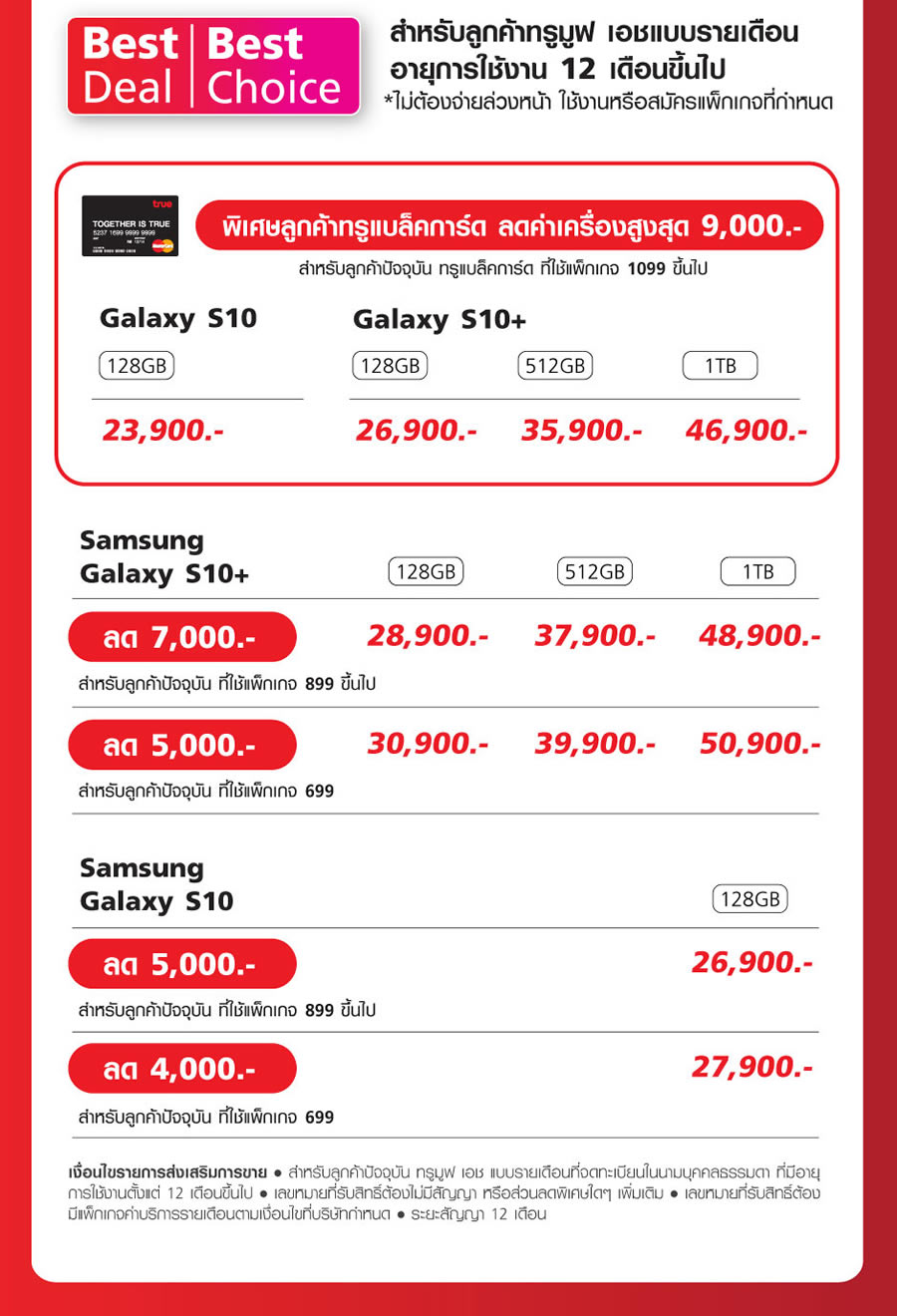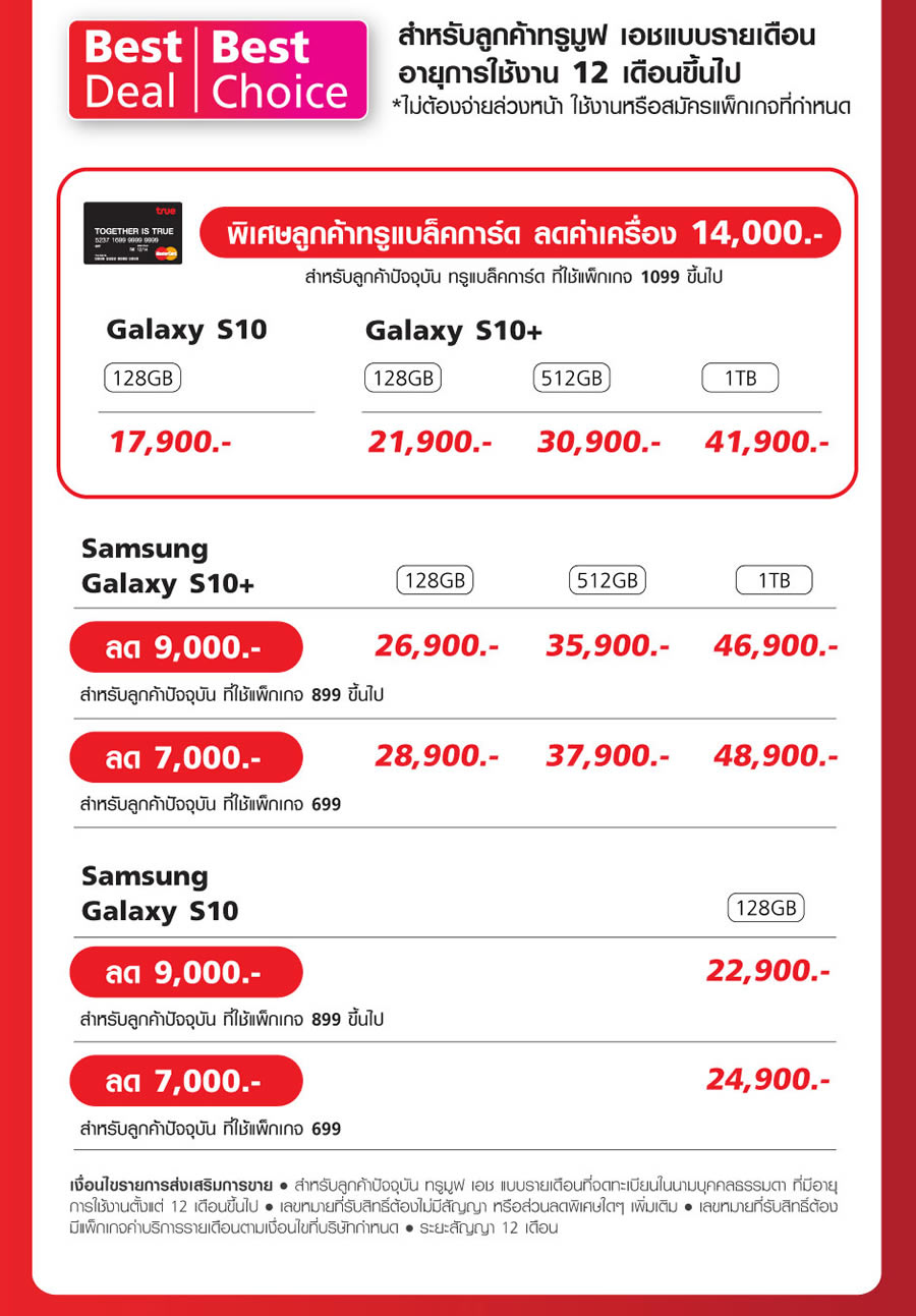 TrueMove H ให้ลูกค้าเป็นเจ้าของ Galaxy S10+ ได้ง่ายขึ้น ในราาเริ่มต้นเพียง 7,450 บาท เมื่อนำ Galaxy S9+ มาแลกซื้อ และให้ผ่อนค่าเครื่องสบายๆ 0% นานสูงสุด 24 เดือน กับธนาคารที่ร่วมรายการ