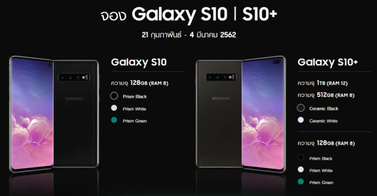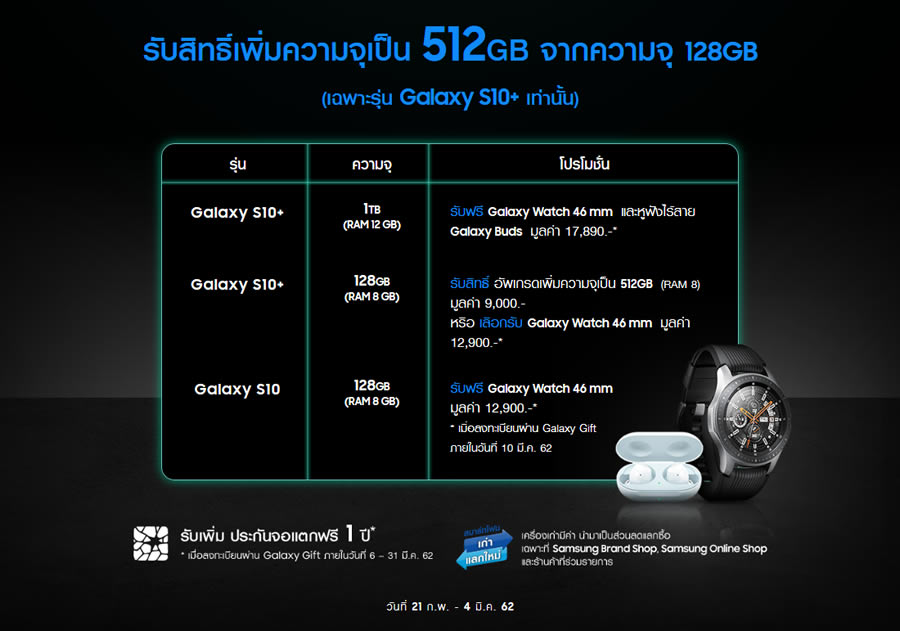 Samsung ให้แฟนๆ ชาวไทย เป็นเจ้าของสมาร์ทโฟน Samsung Galaxy S10+ รุ่น 512GB ในราคาเดียวกับรุ่น 128GB เมื่อจับจองเป็นเจ้าของตั้งแต่วันนี้ ไปจนถึงวันที่ 4 มีนาคม 2562 ซึงจะช่วยให้ลูกค้าประหยัดเงินไปได้ถึง 9,000 บาท หรือเลือกรับ Galaxy Watch 46 mm มูลค่า 12,900 บาท เป็นของแถม