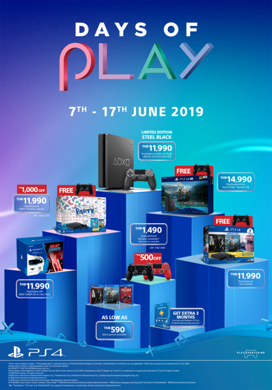 ปีนี้นับเป็นปีที่สามแล้วที่มีการจัดเทศกาลโปรโมชั่นพิเศษ Days of Play  นี้ขึ้นทั่วโลก พบข้อเสนอสุดพิเศษจากร้านค้าปลีก และบน PlayStation® Storeอันประกอบไปด้วยเครื่องเกมคอนโซล PS4 ลวดลายพิเศษ Days Gone (SIE Worldwide Studios) วางจำหน่ายเมื่อวันที่ 26 เมษายน 2562, Marvel’s Spider Man, God of War และข้อเสนออื่นๆ อีกมากมายสำหรับเครื่องเกมคอนโซล PlayStation®, อุปกรณ์ต่างๆ, เกม และบริการเน็ตเวิร์คต่างๆ ของทาง PlayStation
