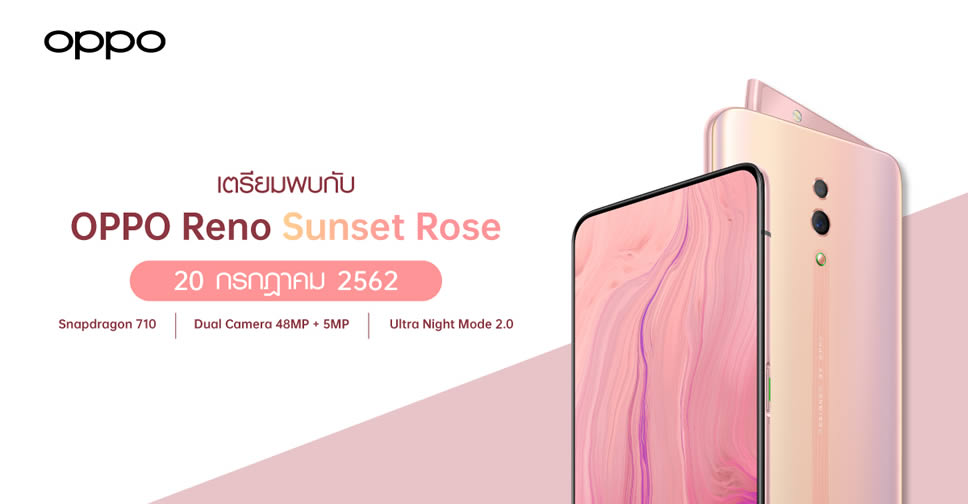 จากเดิมที่วางจำหน่ายเพียงแค่สอง 2 สี คือ Jet Black และ Ocean Green ด้วยเทคโนโลยีทรงพลัง พร้อมกล้องหลังที่ทรงประสิทธิภาพ รวมถึงดีไซน์สุดพรีเมี่ยม ทำให้ OPPO Reno Series ได้รับกระแสตอบรับเป็นอย่างดี และล่าสุด OPPO เตรียมวางจำหน่าย OPPO Reno สี Sunset Rose ในวันที่ 20 กรกฎาคมนี้ ในราคาเพียง 16,990 บาทเท่านั้น