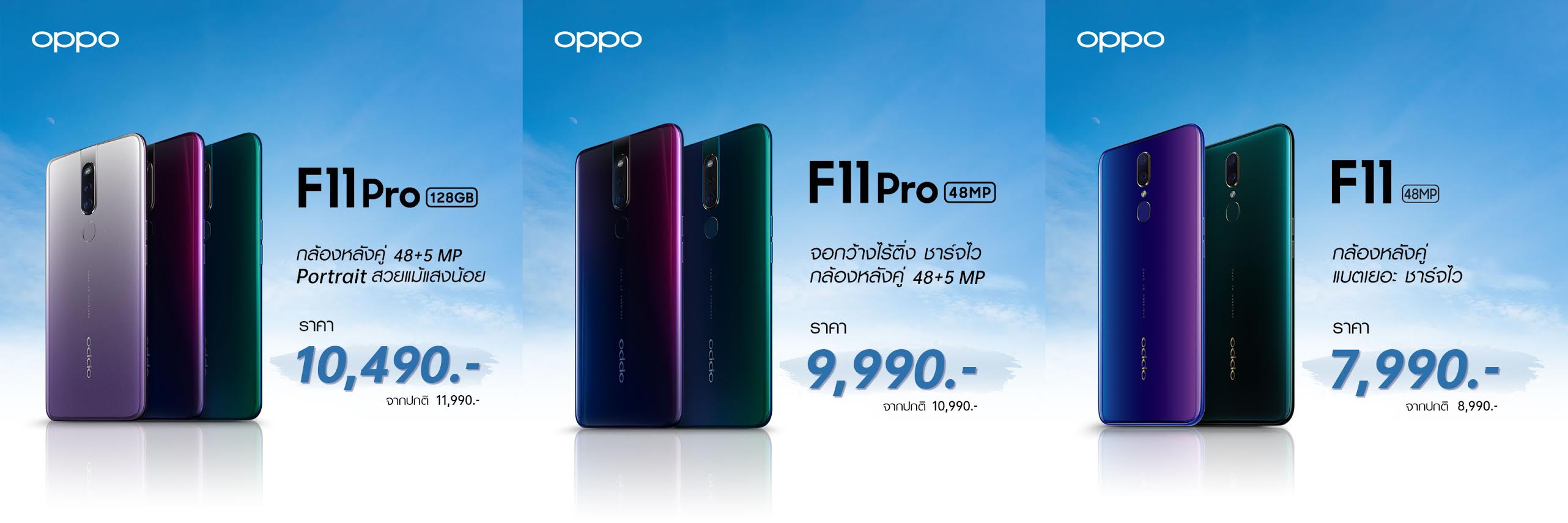 OPPO F11 Pro 128 GB สมาร์ทโฟนที่อัดแน่นด้วยคุณภาพ ไม่ว่าจะเป็นกล้องหลังคู่ 48+5 ล้านพิกเซล ระบบชาร์จไว VOOC Flash Charge 3.0 ที่ชาร์จไวขึ้นถึง 20% มาพร้อมแบตเตอร์รี่ 4000 mAh อีกทั้งหน้าจอ Panoramic Screen กว้างไร้ติ่งขนาด 6.5 นิ้ว ความคมชัดระดับ FHD+ ประมวลผลได้ไวยิ่งขึ้นด้วย Hyper Boost สวยสะดุดตาโดดเด่นไม่เหมือนใครด้วยดีไซน์ไล่เฉดสี และยังมี RAM 6 GB + ROM 128 GB ในราคา 10,490 บาท และ OPPO F11 Pro 64 GB ราคา 9,990 บาท