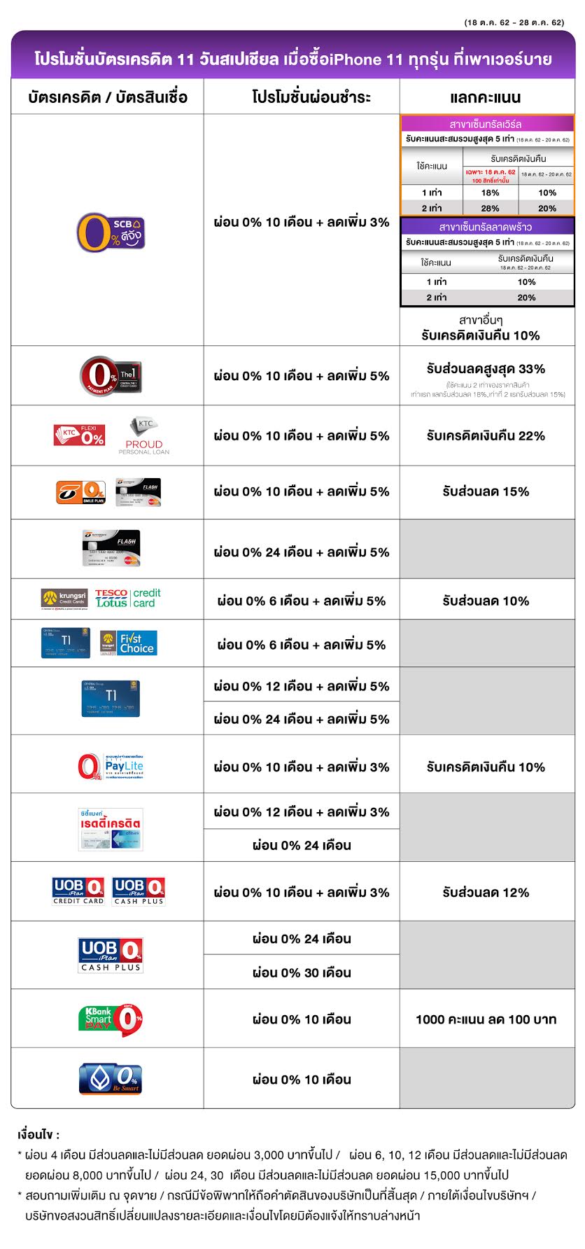 เพาเวอร์บาย ในฐานะตัวแทนจำหน่ายอย่างเป็นทางการของ Apple (ประเทศไทย) มอบข้อเสนอด้วยโปรแรงสุดคุ้มและบริการจัดเต็มเหนือกว่าทุกปี ให้คุณเป็นเจ้าของ iPhone 11 , iPhone 11 Pro และ iPhone 11 Pro Max เครื่องเปล่าไม่ติดสัญญา ทุกสี ทุกรุ่นขนาดความจุพร้อมประกันศูนย์นาน 1 ปี ได้แล้ววันนี้ ปีนี้ยกทัพโปรแรงอัดแน่นให้สาวก iPhone เลือกช้อปที่ใช่ กับโปร 11 วันสเปเชียล จากบัตรเครดิตชั้นนำมากมายอาทิใช้คะแนนบัตรเครดิตเป็นส่วนลดพร้อมรับเครดิตเงินคืนสูงสุด 22% หรือผ่อน 0% พร้อมส่วนลด 5% หรือจะเลือกผ่อน 0% สูงสุด 30 เดือนเริ่มตั้งแต่วันนี้ – 28 ต.ค. 2562