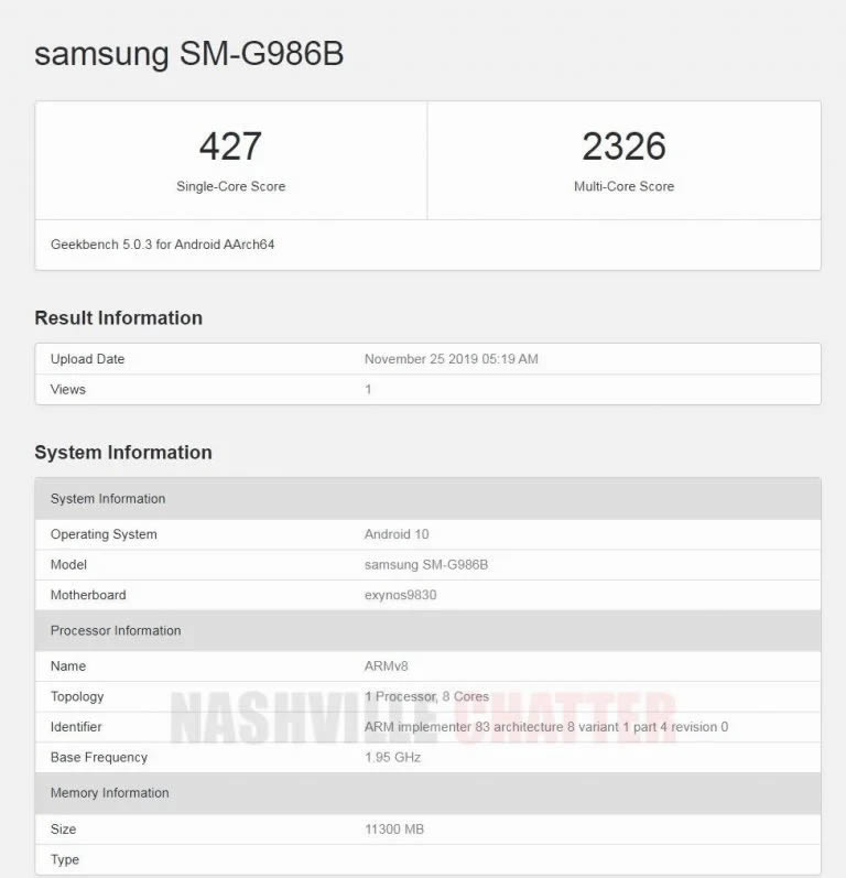 ข้อมูลจาก Geekbench ยืนยันว่า Samsung Galaxy S11 ทำงานบนพื้นฐาน Android 10 ใช้ชิปประมวลผลรุ่นใหม่ Exynos 9830 และมาพร้อม RAM 12GB