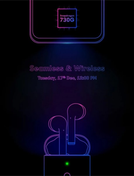 realme ได้เปิดเผยกับสื่อมวลชนว่าจะจัดกิจกรรมพิเศษขึ้นในวันที่ 17 ธันวาคมนี้ ในนิวเดลี ประเทศอินเดีย พร้อมส่งบัตรเชิญที่มีภาพโครงร่างของหูฟังไร้สายแบบ True Wireless พร้อมด้วยสมาร์ทโฟนที่มาพร้อมชิปประมวลผล Snapdragon 730G