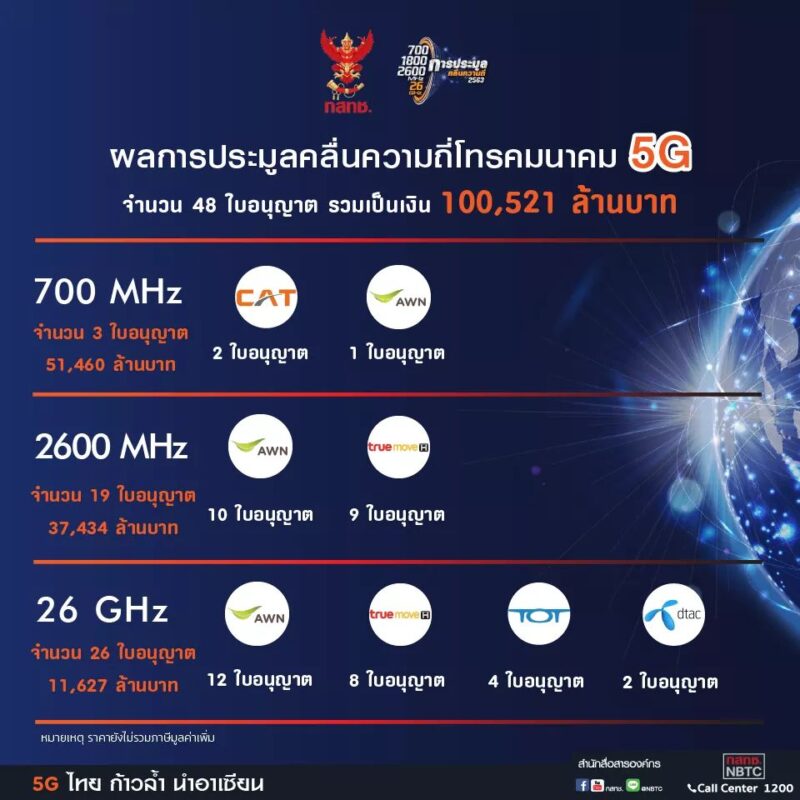 แบ่งเป็น คลื่นความถี่ 700 MHz เงินประมูลรวม 51,460 ล้านบาท คลื่นความถี่ 2600 MHz เงินประมูลรวม 37,434 ล้านบาท และคลื่นความถี่ 26 GHz เงินประมูลรวม 11,627 ล้านบาท