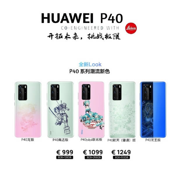 แหล่งข่าวในประเทศจีน แชร์ภาพหลุด Huawei P40 series รุ่นพิเศษ ที่มีให้เลือกอย่างน้อย 8 ลาย อย่างเช่น Dragon Edition, Gundam Edition และ Aerospace Edition แต่ละลายวางจำหน่ายในราคาแตกต่างกัน ตามความจำภายใน