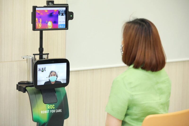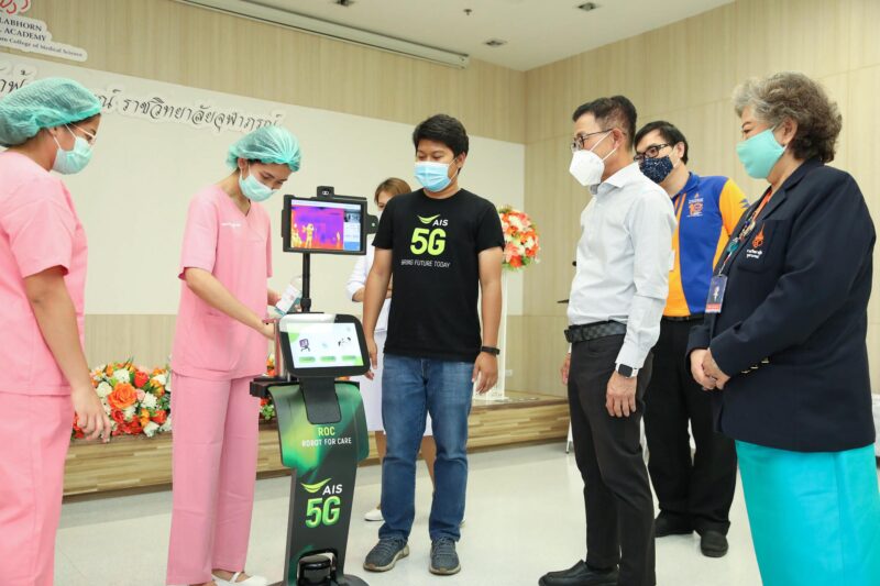 2. ส่งมอบหุ่นยนต์บริการทางการแพทย์ 5G ROBOT FOR CARE เพื่อปฏิบัติหน้าที่เป็นผู้ช่วยแพทย์ในการดูแลพยาบาลผู้ป่วยโควิด-19 โดยนำเทคโนโลยีขั้นสูงที่หลากหลาย อาทิ เทคโนโลยีอินฟราเรด ตรวจวัดอุณหภูมิร่างกายได้อย่างแม่นยำ, เทคโนโลยี 3D Mapping กำหนดแผนที่เส้นทางเดินของหุ่นยนต์ ให้เคลื่อนที่เข้าหาผู้ป่วยได้โดยอัตโนมัติ, Telemedicine ระบบปรึกษาทางไกลระหว่างแพทย์และผู้ป่วยผ่าน Video Call เพื่อให้แพทย์ที่อยู่ด้านนอกห้องใช้สมาร์ทดีไวซ์ เชื่อมต่อมาที่ตัวหุ่นยนต์ เพื่อพูดคุยและดูอาการคนไข้ภายในห้องพักได้ ทำงานบนเครือข่าย 5G ภายใต้ระบบประมวลผล AIS Robot Platform ซึ่งเอไอเอสพัฒนาขึ้นเอง ช่วยหลีกเลี่ยงการเข้ามาสัมผัสหรือใกล้ชิดกับผู้ป่วยโดยตรง และสามารถ Customized ให้ตอบโจทย์การใช้งานของแต่ละโรงพยาบาล โดยจะถูกนำไปใช้งาน ณ หอผู้ป่วยในของผู้ป่วยโควิด-19 โรงพยาบาลจุฬาภรณ์