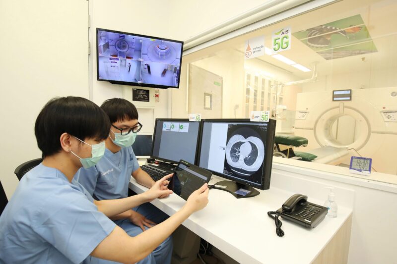 1. นำ 5G สนับสนุนการพัฒนาระบบประมวลผล AI อัจฉริยะสำหรับเครื่อง CT Scan ปอด บนเครือข่าย 5G เครื่องแรกของไทย เพิ่มประสิทธิภาพการทำงานของเครื่อง CT Scan ให้สามารถส่งภาพปอดที่มีไฟล์ขนาดกว่า 300 MB ขึ้นไปประมวลผลผ่านระบบ AI-assisted Medical Imaging Solutions for COVID-19 ได้อย่างรวดเร็ว โดย ระบบ AI จะทำการเปรียบเทียบภาพปอดของผู้ป่วยโควิด-19 ในประเทศจีนและไทยที่มีอยู่จำนวนหลายเคส บน Cloud Computing และประมวลผลว่าปอดของผู้ป่วยคนนี้ มีแนวโน้มที่จะติดเชื้อโควิด-19 หรือไม่ และอยู่ในระยะไหน ซึ่งให้ผลแม่นยำถึง 96% และช่วยลดเวลาทำงานของบุคลากรทางการแพทย์ได้อย่างมาก จากเดิม 1 ชั่วโมง เหลือเพียง 30 วินาทีเท่านั้น ทำให้การวินิจฉัยโรคแม่นยำและรวดเร็วยิ่งขึ้น นำไปสู่การรักษาพยาบาลที่รวดเร็วและทันท่วงที ทั้งนี้ เครือข่าย 5G ยังมีประโยชน์ที่เด่นชัดอย่างมากในด้าน Mobility ซึ่งหากมีการนำเครื่องมือและอุปกรณ์ทางการแพทย์ไปใช้งานในพื้นที่ห่างไกล ที่ไม่สามารถลากสายไฟเบอร์ออฟติกได้เข้าไปปล่อยสัญญาณได้ ก็สามารถใช้เครือข่าย 5G ได้แทน