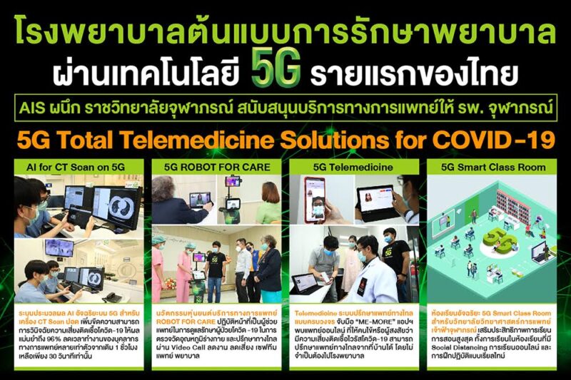 เดินหน้าภารกิจเร่งด่วน AIS 5G สู้ภัยโควิด-19 ต่อเนื่อง นำเครือข่าย 5G อัจฉริยะ เสริมศักยภาพวงการแพทย์และสาธารณสุข ตั้งแต่ต้นน้ำถึงปลายน้ำ โดยผนึก ราชวิทยาลัยจุฬาภรณ์ ร่วมพัฒนา 5G Total Telemedicine Solutions เต็มรูปแบบ เพื่อสนับสนุนบริการทางการแพทย์ให้โรงพยาบาลจุฬาภรณ์ ยกเป็น โรงพยาบาลต้นแบบแห่งการรักษาพยาบาลผ่านเทคโนโลยี 5G รายแรกของไทย