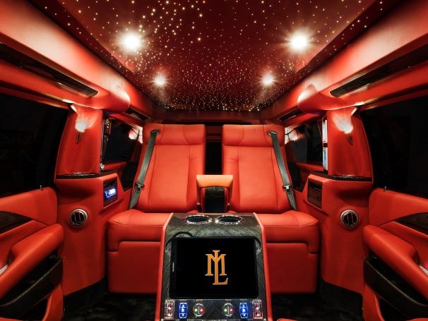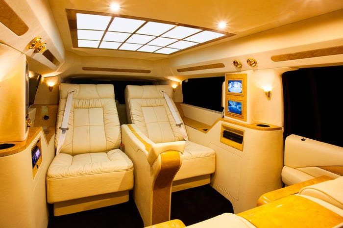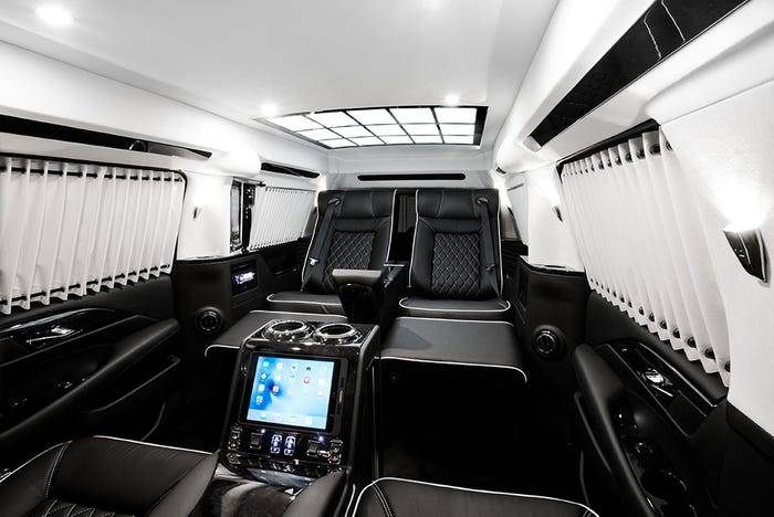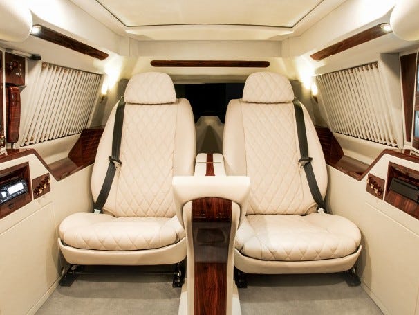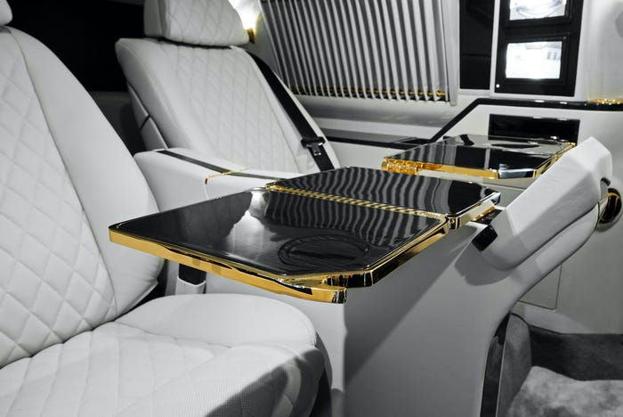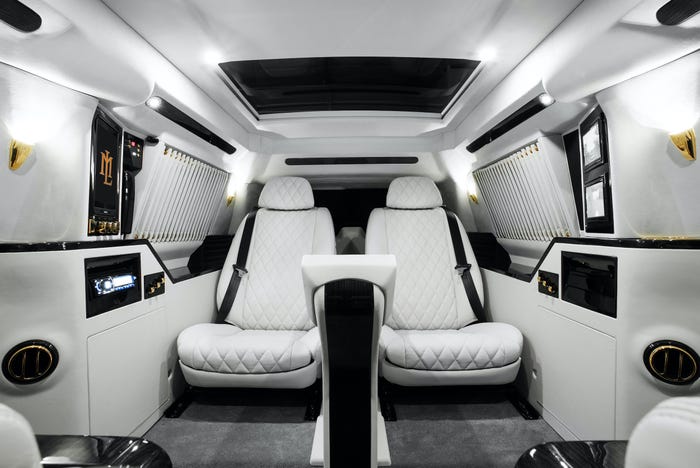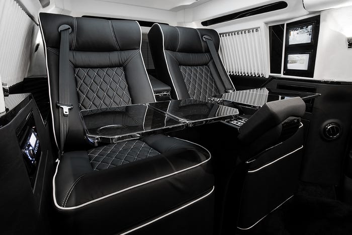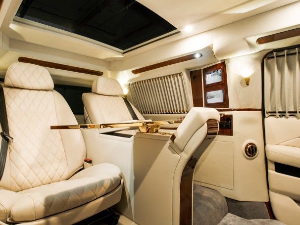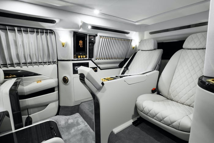 ได้รับการตกแต่งภายในเหมือนนั่งอยู่ในเครื่องบินเจ็ตส่วนตัว ที่นั่งมาพร้อมโต๊ะพับแบบที่ใช้งานบนเครื่องบิน เพิ่มความหรูด้วยขอบทอง 24 กะรัต หน้าต่างทุกบานมีผ้าม่านเพิ่มความเป็นส่วนตัว ห้องโดยสารรองรับ 2 ที่นั่ง ปรับได้ 18 ทิศทาง หุ่มด้วยหนังคุณภาพสูงจากอิตาลี มาพร้อมเครื่องทำความร้อนและเครื่องนวดไฟฟ้า