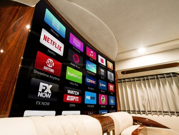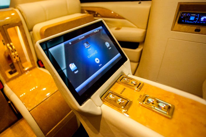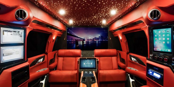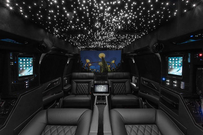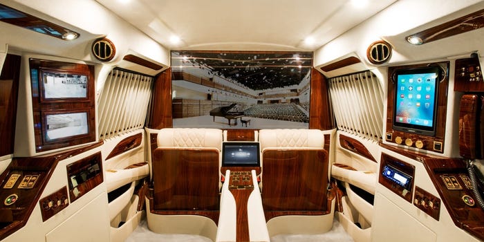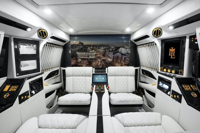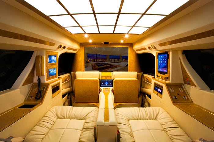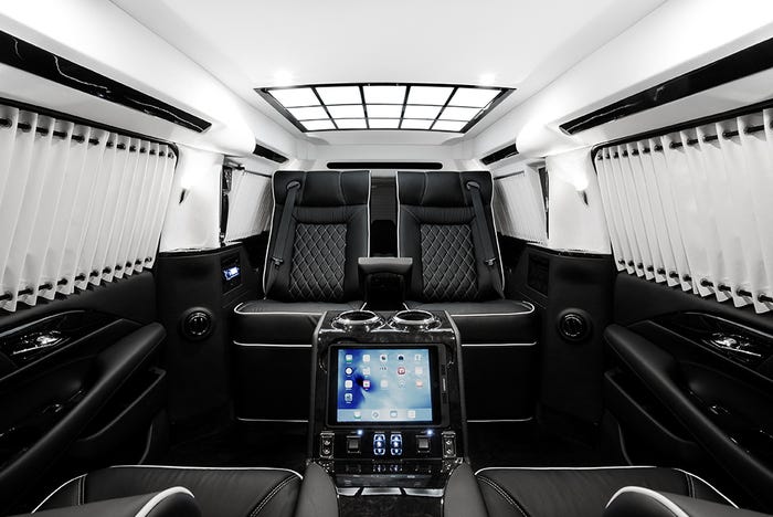 เพิ่มความโอ่อ่าด้วยหลังคาสกายไลท์ ด้านข้างติดจอแสดงผล 7 นิ้ว ไว้ 2 จอ เพื่อมองเห็นสิ่งที่เกิดขึ้นรอบตัวรถ ตอบสนองความบันเทิงด้วยจอทีวี LED ขนาด 40 นิ้ว พร้อมด้วย iPad Air และควบคุมความบันเทิงผ่านจอสัมผัสขนาดใหญ่ที่ฝังไว้ตรงที่พักแขน