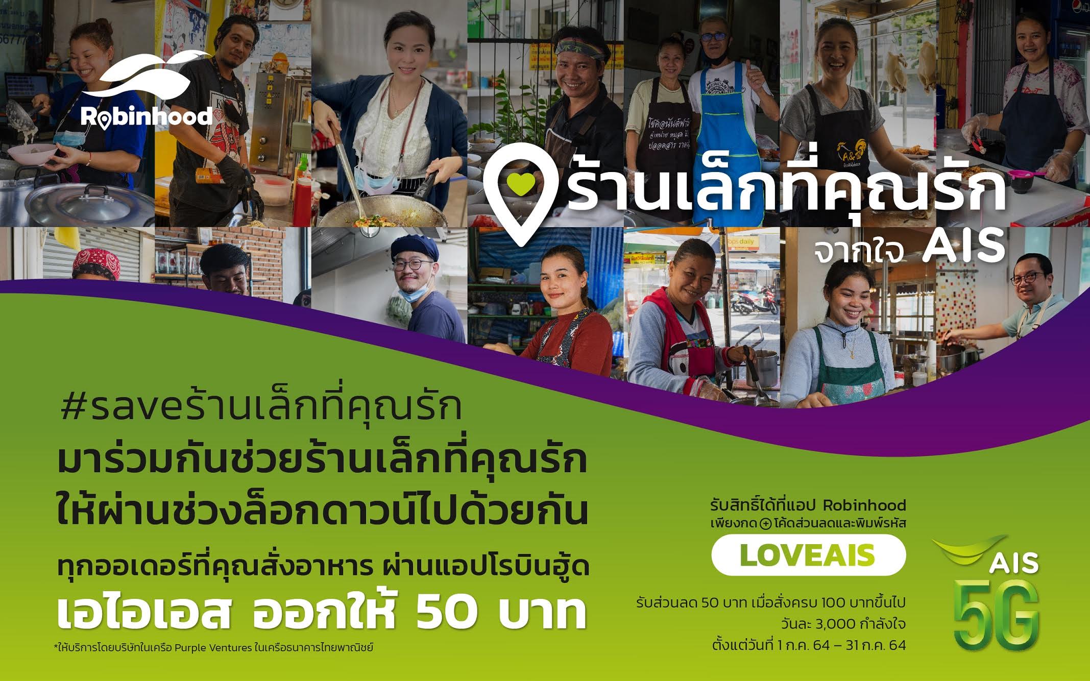 ความพิเศษเพื่อลูกค้าจาก AIS 5G และ โรบินฮู้ด สุดยอดผู้ให้บริการ Food Delivery ยังคงมีอย่างต่อเนื่อง หลังจากผลการตอบรับอย่างดียิ่งจากแคมเปญ “ผนึกกำลังกิน ฟินอยู่บ้าน” ล่าสุดด้วยสถานการณ์โควิด-19 ที่ยังน่ากังวล รวมถึงการประกาศล็อคดาวน์กรุงเทพฯ, ปริมณฑลและบางจังหวัดตั้งแต่วันนี้ จึงร่วมกันส่งแคมเปญ “ร้านเล็กที่คุณรัก” ด้วยส่วนลดพิเศษ เมื่อสั่งอาหารจากร้านอร่อยรายย่อยผ่านโรบินฮู้ด เพื่อแทนความห่วงใย พร้อมส่งกำลังใจช่วยผู้ประกอบการร้านอาหาร