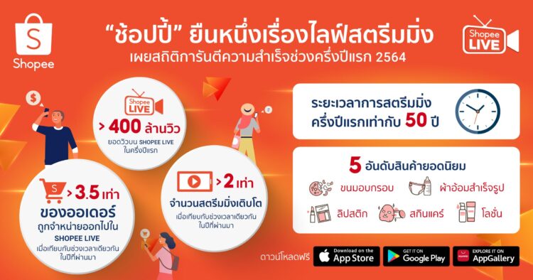 - 5 อันดับสินค้าที่ได้รับความนิยมสูงสุดใน Shopee Live ได้แก่ ขนมอบกรอบ, ผ้าอ้อมสำเร็จรูป, ลิปสติก, สกินแคร์ และ โลชั่น