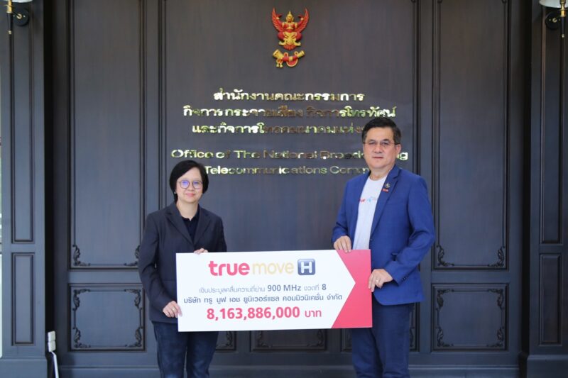 สำนักงานคณะกรรมการกิจการกระจายเสียง กิจการโทรทัศน์ และกิจการโทรคมนาคมแห่งชาติ โดย นางสาวจิตสถา ศรีประเสริฐสุข ผู้ช่วยเลขาธิการ กสทช. สายงานกิจการโทรคมนาคม(ซ้าย) รับมอบเงินค่าประมูลคลื่นความถี่สำหรับกิจการโทรคมนาคมย่าน 900 MHz คลื่นความถี่ช่วง 905 – 915 MHz / 950 – 960 MHz งวดที่ 8 ที่ได้จัดสรรไปเมื่อวันที่ 16 มีนาคม 2559 จาก บริษัท ทรูมูฟ เอช ยูนิเวอร์แซล คอมมิวนิเคชั่น จำกัด โดย นายจักรกฤษณ์ อุไรรัตน์ (ขวา) รักษาการหัวหน้าคณะผู้บริหาร ด้านกิจการองค์กร บมจ. ทรู คอร์ปอเรชั่น จำนวน 8,163.886 ล้านบาท (รวมภาษีมูลค่าเพิ่มแล้ว) โดย ทรู บริษัทโทรคมนาคม-เทคโนโลยีชั้นนำ มุ่งเปลี่ยนผ่านวิถีชีวิตคนไทยและขับเคลื่อนธุรกิจ ด้วยความแข็งแกร่งด้านโครงข่ายโทรคมนาคมและโครงสร้างพื้นฐานดิจิทัล ยกระดับมาตรฐานคุณภาพโครงข่ายทั่วประเทศอย่างต่อเนื่อง พร้อมให้บริการที่มีประสิทธิภาพสูงผ่านคลื่นความถี่ทั้ง 7 ย่านความถี่ นอกจากนี้ยังได้เปิดโรมมิ่งให้ลูกค้าทรูมูฟ เอช ใช้งานบนคลื่น 700 MHz ของดีแทค เพื่อเพิ่มความครอบคลุมภูมิภาคและการใช้งานในพื้นที่ห่างไกล และเพิ่มสัญญาณอินเทอร์เน็ตความเร็วสูงในเมือง เช่น อาคารสูง และคอนโดมิเนียมที่พักอาศัย ช่วยลดช่องว่างในการเข้าถึงเทคโนโลยีสื่อสารและดิจิทัล พร้อมรองรับทุกมิติการใช้งานของคนไทย เติมเต็มชีวิตที่ดีกว่า เมื่อมีกันและกัน