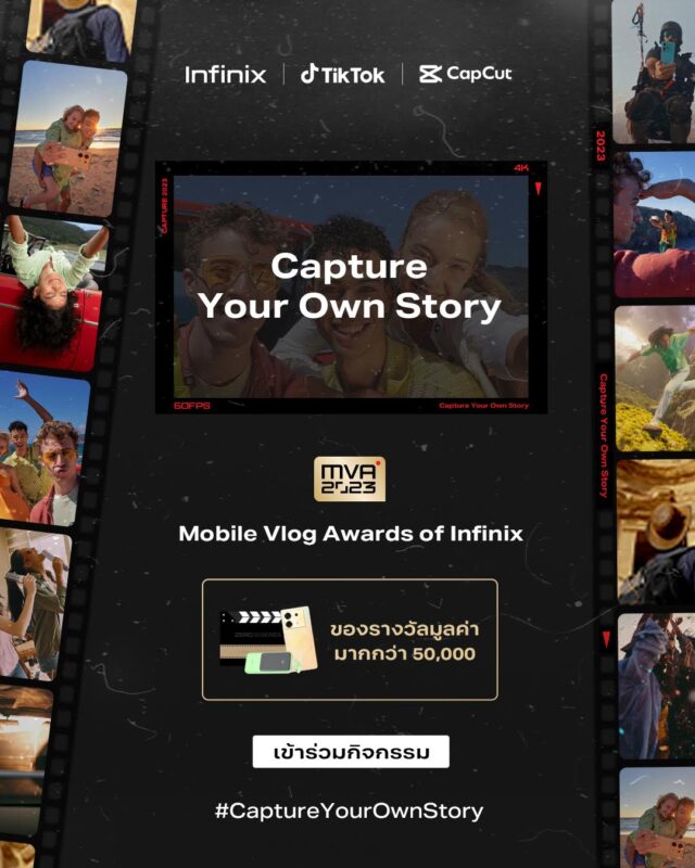 ทั้งนี้ อินฟินิกซ์ยังตั้งใจมอบความพิเศษด้วยการจัด Global Vlog Campaign ซึ่งเป็นแคมเปญประกวด Vlog ระดับโลก ที่มีการจัดขึ้นในหลายประเทศ รวมถึงในประเทศไทยก็เข้าประกวดด้วยเช่นกัน โดยมีจุดประสงค์เพื่อส่งเสริมให้คนรุ่นใหม่ถ่ายทอดเรื่องราวของตนเอง เพราะเราเชื่อมั่นว่าทุกคนสามารถเป็นนักเล่าเรื่องได้ โดย Infinix จับมือกับ TikTok และ CapCut ในการสร้างเทมเพลตสุดพิเศษ 4 แบบ ให้ทุกคนได้เลือกใช้ และร่วม challenge ด้วยกัน ซึ่งประเทศไทยจะเริ่มแคมเปญในวันที่ 25 กันยายน 2566 โดยใช้แฮชแท็ก #CaptureYourOwnStory โดยผู้ชนะจะได้รับรางวัลรวมมูลค่าสูงสุด 50,000 บาท สำหรับผู้ที่สนใจสามารถติดตามรายละเอียดกิจกรรมได้เร็ว ๆ นี้ ทางช่องทางของอินฟินิกซ์