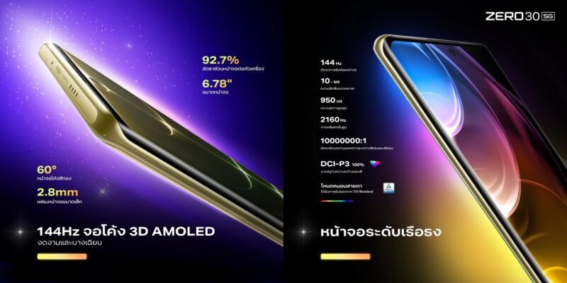 สำหรับในรุ่นนี้ได้มีการดีไซน์ให้ตัวเครื่องมีความพรีเมียม เรียบหรู ทันสมัย ด้วยหน้าจอโค้งขอบสีทอง กับกรอบที่แคบเพียง 2.8 มม. จึงทำให้เป็นสมาร์ตโฟนที่เพรียวบางและมีสไตล์ จับถนัดมือ ที่พร้อมมอบประสบการณ์การรับชมภาพคอนเทนต์ความบันเทิงต่าง ๆ ได้อย่างสมจริงและไร้รอยต่อ อีกทั้งยังเหนือชั้นด้วยหน้าจอคมชัด AMOLED 10-bit ด้วยอัตรารีเฟรชเรทที่เร็วเป็นพิเศษ 144Hz และอัตราความไวในการสัมผัสหน้าจอที่รวดเร็ว 360Hz จึงทำให้ทุกการปัดและสัมผัสลื่นไหล พร้อมให้ทุกคนสามารถรับชมภาพระดับพรีเมียมที่ไม่เหมือนใคร นอกจากนี้ ZERO 30 5G มาพร้อมกับกระจก Corning® Gorilla® ที่กันการตกกระแทกได้ทั้งสองด้าน ให้ความทนทานและความแข็งแกร่งเป็นพิเศษ ทำให้ทนต่อการตกหล่นและแรงกระแทกได้สูง