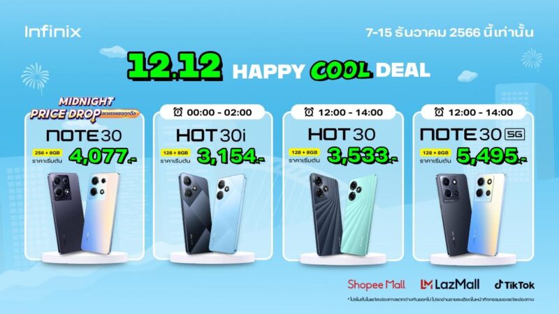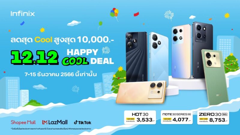 อินฟินิกซ์ (Infinix) แบรนด์สมาร์ตโฟนราคาคุ้มค่า ครบครันทุกการใช้งาน และตอบโจทย์ไลฟ์สไตล์คนรุ่นใหม่ ร่วมสร้างสีสันเติมเต็มบรรยากาศแห่งการเฉลิมฉลองส่งท้ายปี เอาใจนักช้อปออนไลน์ด้วยโปรโมชันสุดปัง ในมหกรรมช้อปปิ้งสุดยิ่งใหญ่ 12.12 ที่ให้ทุกคนเป็นเจ้าของสมาร์ตโฟนคุณภาพดีจาก Infinix ในราคาคุ้มค่าที่สุด ด้วยส่วนลดสูงสุด 1,615 บาท* พร้อมรับข้อเสนอพิเศษ เมื่อสั่งซื้อสินค้าที่ Infinix Official Store บน Shopee, Lazada, และ TikTok Shop ระหว่างวันที่ 7 – 15 ธันวาคม 2566