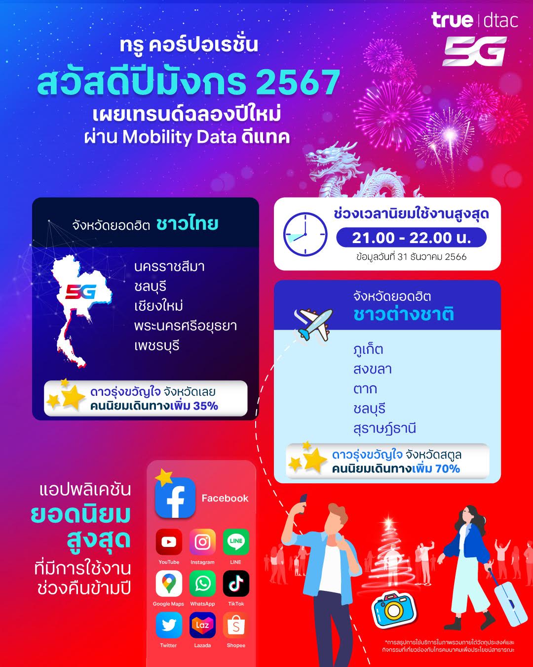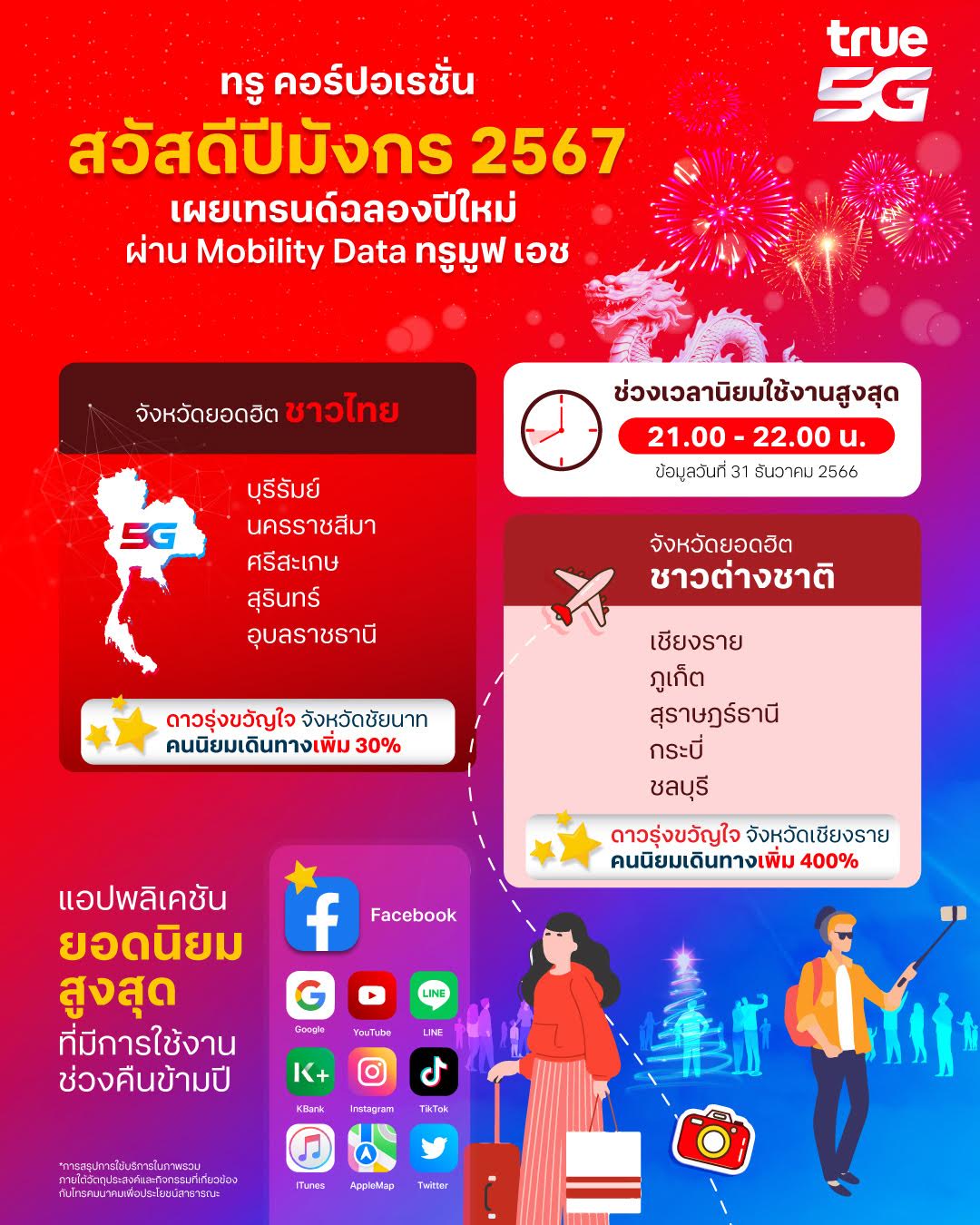 ทรู คอร์ปอเรชั่นชวนส่องเทรนด์การเดินทางท่องเที่ยวปีใหม่ผ่าน Mobility Data หรือข้อมูลภาพรวมการเคลื่อนที่ของผู้ใช้งาน และการใช้มือถือสุดพีคช่วงเทศกาลต้อนรับปีใหม่ 2567 จากผู้ใช้งานแบรนด์ทรู และดีแทค พบไฮไลท์น่าจับตา 10 จังหวัดท่องเที่ยวยอดนิยมคนไทยและต่างชาติ พร้อมรายงานโซเชียล 10 แอปพลิเคชันครองใจคนใช้งาน ขณะที่แอปทรูไอดี (TrueID) มียอดใช้งานโตขึ้นราว 20% ในช่วงเทศกาลส่งความสุขเคานต์ดาวน์ก่อนเข้าปีมังกร