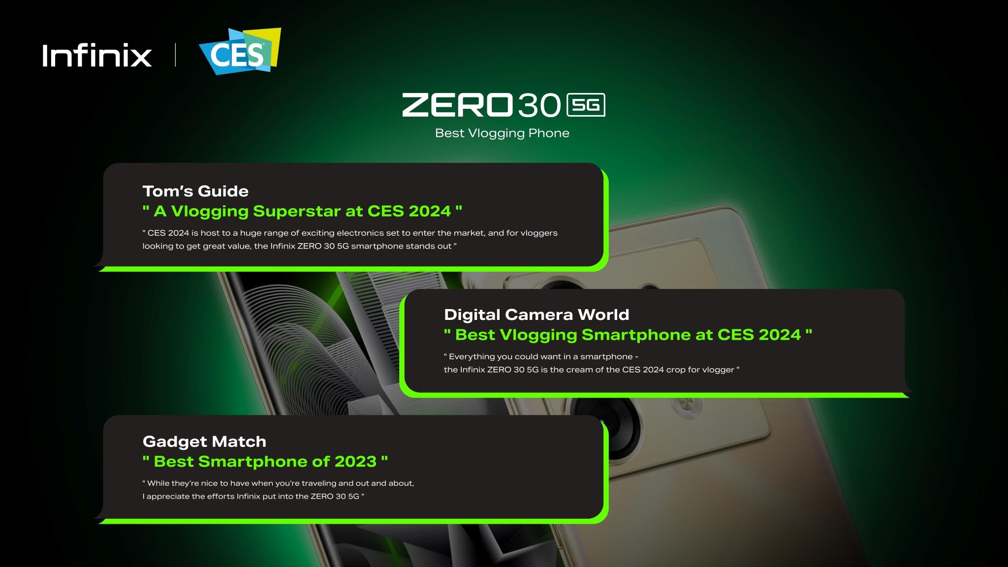 นอกจากนี้สมาร์ทโฟนรุ่น ZERO 30 5G ยังได้รับการชื่นชมจาก Tom’s Guide สื่อเทคโนโลยีชั้นนำว่าเป็น “A Vlogging Superstar at CES 2024” และเป็น “Best Vlogging Smartphone at CES 2024” โดย Digital Camera World สื่อถ่ายภาพชื่อดังระดับโลกอีกด้วย
