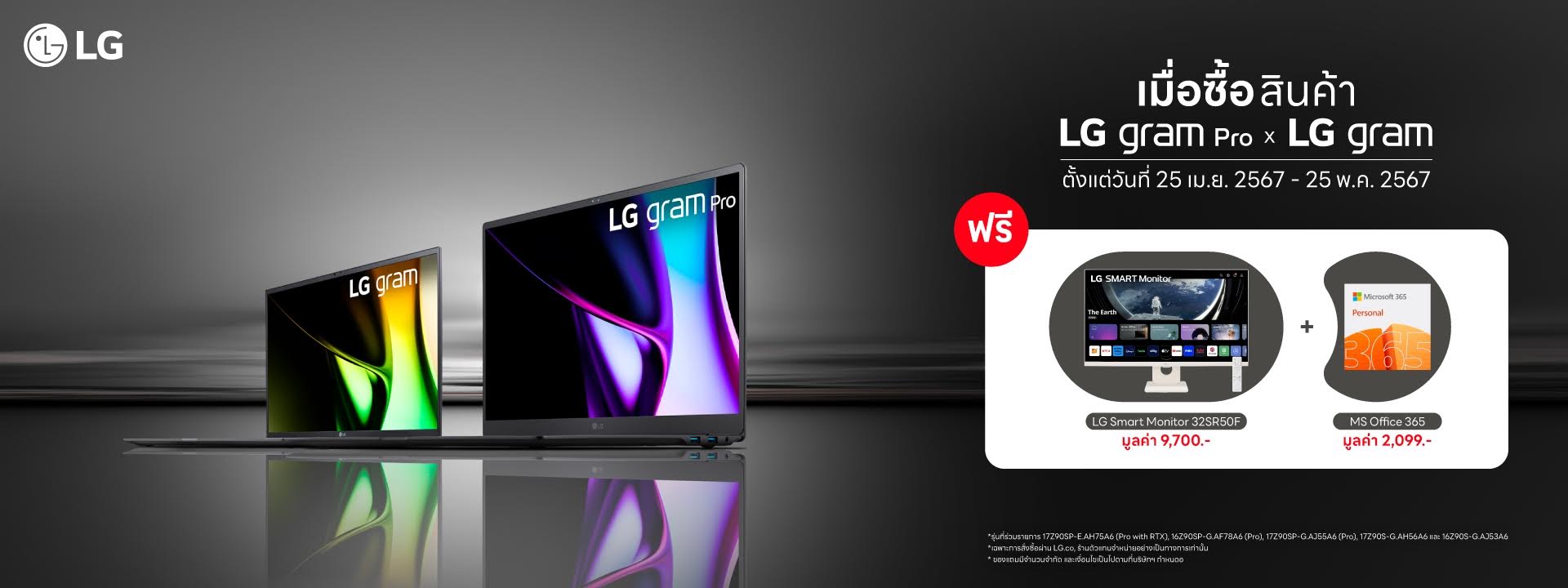 แอลจี บอกโปรฯ สุดคุ้มเมื่อซื้อแล็ปท็อป LG gram และ LG gram Pro รุ่นใหม่ล่าสุดประจำปี 2024 รับฟรี LG Smart Monitor รุ่น 32SR50F ขนาด 32 นิ้ว มูลค่า 9,700 บาท ให้ไปเสริมมุมมองการใช้งานแล็ปท็อปเพื่อการทำงานและความบันเทิงอย่างครบครัน และรับฟรี Microsoft Office 365 มูลค่า 2,099 บาท โปรโมชันสุดพิเศษนี้สำหรับผู้ที่ซื้อตั้งแต่วันที่ 25 เมษายน – 25 พฤษภาคม 2567 เท่านั้น* ทางเว็บไซต์ www.lg.com ร้านค้าตัวแทนจำหน่าย หรือช่องทางออนไลน์ทั้ง Lazada และ Shopee ดูรายละเอียดเพิ่มเติมเกี่ยวกับโปรโมชันได้ที่ https://www.lg.com/th/promotions/2024_free_smartmnt/