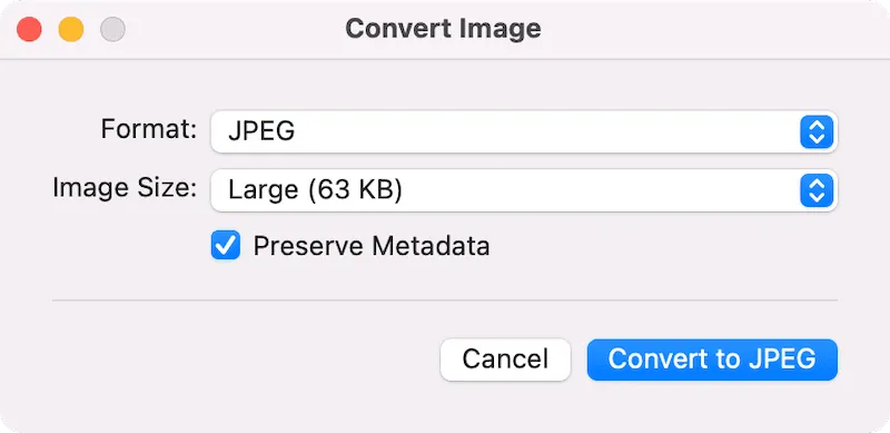 แอป Preview ที่มาพร้อม Mac สามารถบีบอัดภาพได้ด้วยการเปล่ยนรูปแบบไฟล์ เพียงเปิดรูปภาพที่ต้องการด้วย Preview คลิก File จากแถบเมนูด้านบน เลือก Export จากนั้นสามารถเปลี่ยนรูปแบบไฟล์ได้ที่ Format ซึ่งมีรูปแบบไฟล์ HEIC ให้เลือกด้วย แต่บางอุปกรณ์อาจไม่รองรับ