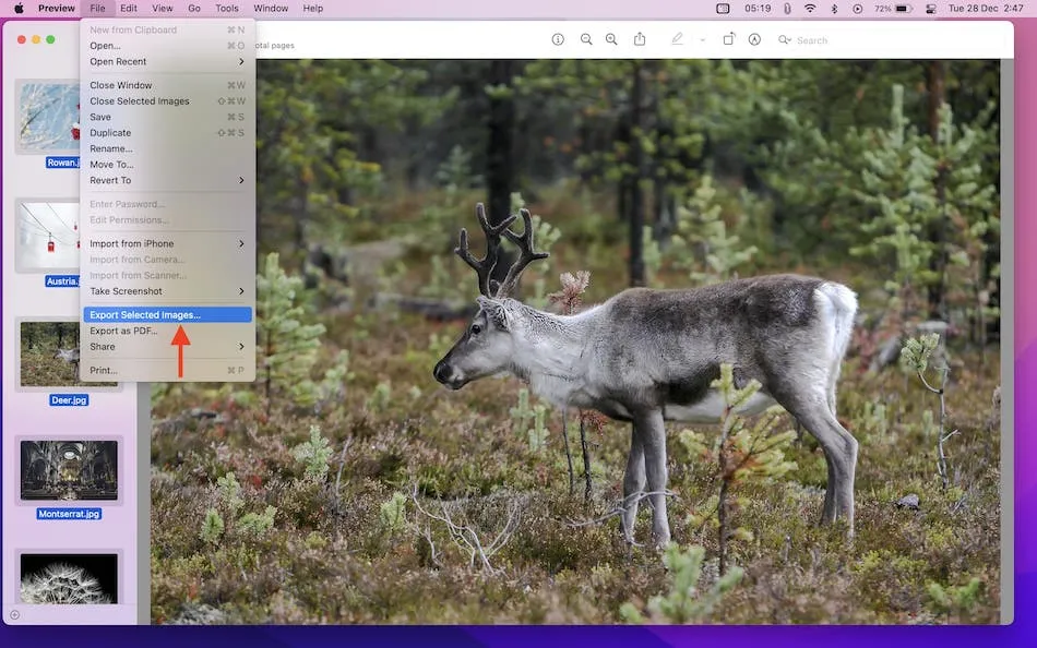 หลังจากแอป Preview ถูกเปิดขึ้นมา ให้เลือกรูปภาพขนาดย่อทางซ้ายมือด้วยการกดปุ่ม Command + A จากนั้นคลิก File จากแถบเมนูด้านบน เลือก Export Selected Images