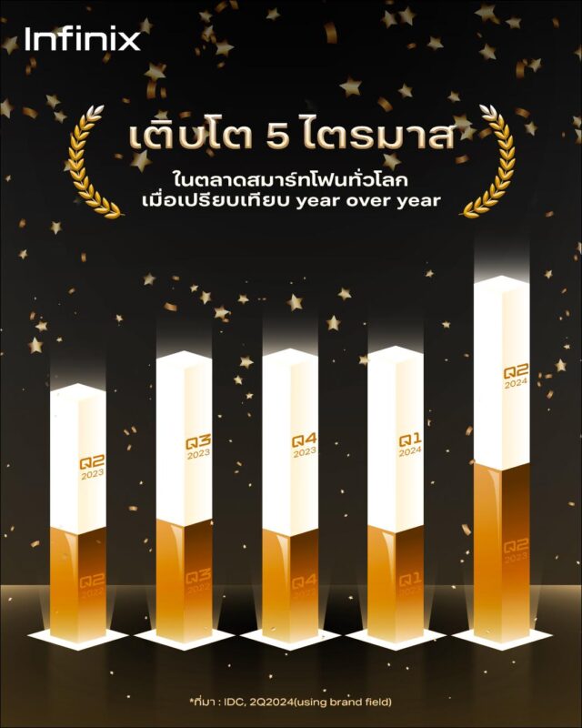 อินฟินิกซ์ (Infinix) แบรนด์สมาร์ทโฟนระดับโลกราคาคุ้มค่า ครบครันทุกการใช้งาน และตอบโจทย์ไลฟ์สไตล์คนรุ่นใหม่ เติบโตต่ออย่างเนื่องเป็นไตรมาสที่ห้าติดต่อกัน โดยข้อมูลจาก Worldwide Quarterly Mobile Phone Tracker ของ IDC เผยว่าว่าอินฟินิกซ์มียอดจัดส่งสมาร์ทโฟนทั่วโลกเพิ่มขึ้น 18.8% ในไตรมาสที่ 2 ปี 2567 เมื่อเทียบกับช่วงเวลาเดียวกันของปี2023 ซึ่งตอกย้ำความสำเร็จของอินฟินิกซ์ที่เพิ่มขึ้นอย่างต่อเนื่องในตลาดโลก