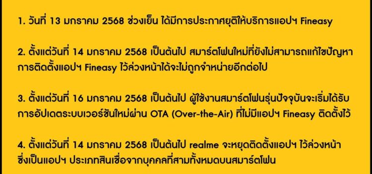 - ตั้งแต่วันที่ 14 มกราคม 2568 เป็นต้นไป realme จะหยุดติดตั้งแอปฯ ไว้ล่วงหน้าซึ่งเป็นแอปฯ ประเภทสินเชื่อจากบุคคลที่สามทั้งหมดบนสมาร์ตโฟน