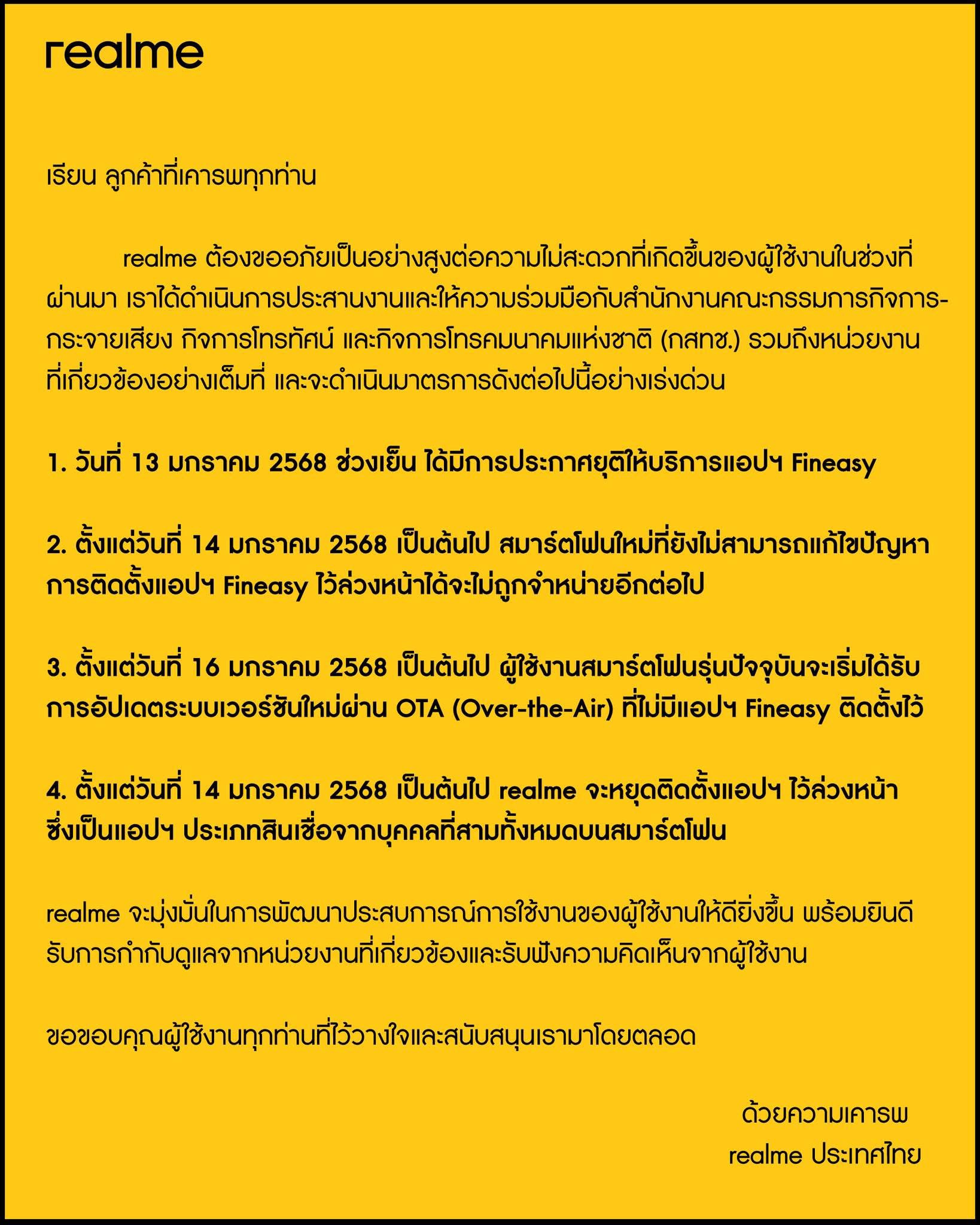 realme ต้องขออภัยเป็นอย่างสูงต่อความไม่สะดวกที่เกิดขึ้นของผู้ใช้งานในช่วงที่ผ่านมา เราได้ดำเนินการประสานงานและให้ความร่วมมือกับสำนักงานคณะกรรมการกิจการกระจายเสียง กิจการโทรทัศน์ และกิจการโทรคมนาคมแห่งชาติ (กสทช.) รวมถึงหน่วยงานที่เกี่ยวข้องอย่างเต็มที่ และจะดำเนินมาตรการดังต่อไปนี้อย่างเร่งด่วน
