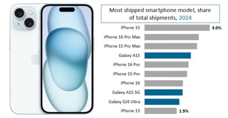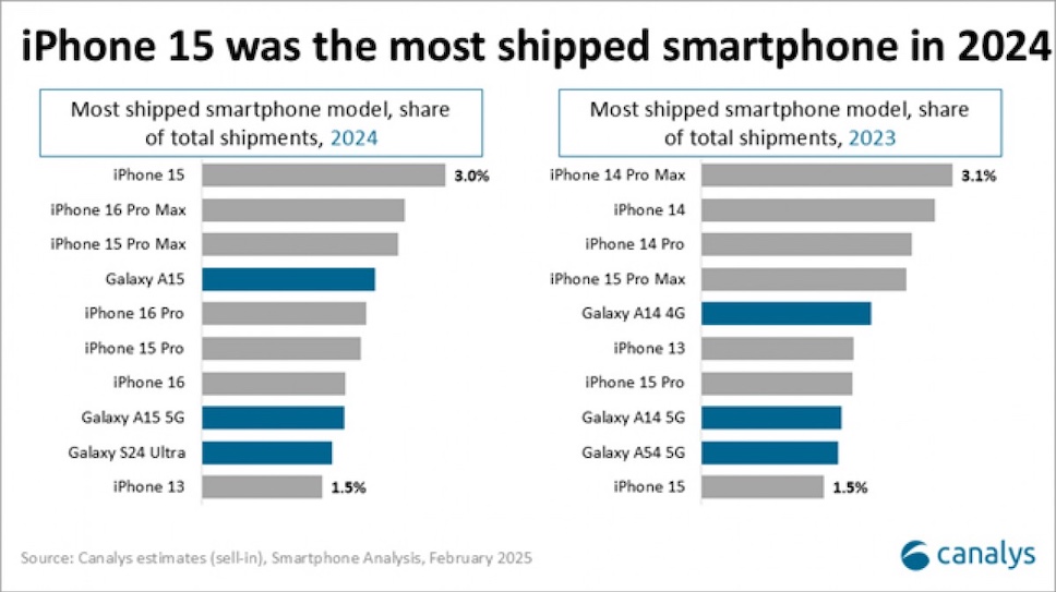รายงานล่าสุดจาก Canalys เปิดเผยว่า Apple ครอบงำตลาดสมาร์ทโฟนในปี 2024 โดยมี iPhone ถึง 7 รุ่น ที่ขายดีติดอยู่ใน 10 อันดับบนสุด และ iPhone 15 ขายดีที่สุด