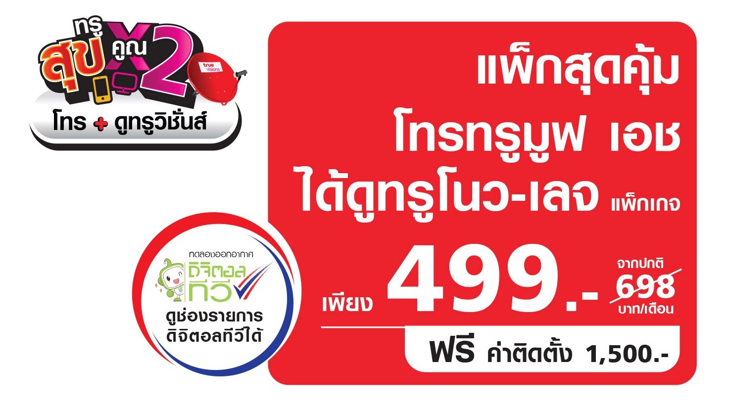 ทรูมูฟ เอช มอบความสุขที่คุ้มค่า ด้วยยุทธศาสตร์คอนเวอร์เจนซ์ของกลุ่มทรู แนะนำแพ็กเกจใหม่ “ทรูสุขคูณ 2 โทร+ดูทรูวิชั่นส์” ให้ลูกค้าได้ทั้งโทรทรูมูฟ เอช และดูทรูวิชั่นส์ ทั้งบนทีวีและมือถือผ่านแอพพลิเคชั่นทรูวิชั่นส์ เอนิแวร์ ในราคาเริ่มต้นเพียงเดือนละ 499 บาท รับความสุขสุดคุ้ม 4 ต่อ
