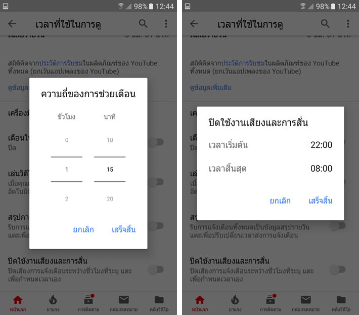 ถัดลงมาในหน้าจอเดียวกัน จะมีเครื่องมือสำหรับการตั้งค่าให้แจ้งเตือนเพื่อพักสายตา เมื่อกดปุ่มเปิดใช้งาน ก็จะมีหน้าต่างให้กำหนดเวลาแจ้งเตือน เมนูถัดมาสำหรับเปิดหรือปิดฟีเจอร์เล่นวีดีโอถัดไปอัตโนมัติ