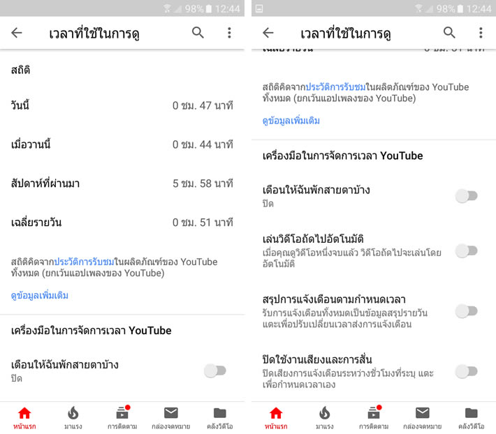 สิ่งที่ต้องทำก็คือ อัพเดทแอพพลิเคชั่น YouTube ให้เป็นเวอร์ชั่นใหม่ จากนั้นเปิดแอพขึ้นมาแล้วเข้าไปที่โปรไฟล์ส่วนตัว จากนั้นเลือกเมนู Time watched หรือ เวลาที่ใช้ในการดู ก็จะพบกับสถิติการดูวีดีโอในแต่ละวัน ของวันนี้ เมื่อวาน สัปดาห์ที่ผ่านมา และค่าเฉลี่ยในแต่ละวัน