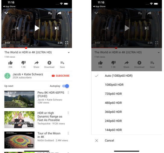 แอพพลิเคชั่น YouTube สำหรับอุปกรณ์ iOS ได้รับการอัพเดทเวอร์ชั่นใหม่ 13.37 ช่วยให้เจ้าของ iPhone XS และ iPhone XS Max รับชมวีดีโอได้คมชัดขึ้น เพราะสนับสนุนการแสดงผลแบบ HDR (High Dynamic Range) เมื่อเลือกปรับคุณภาพหรือความละเอียดของวีดีโอที่กำลังรับชม จะเห็นตัวอักษร HDR อยู่ถัดจากความละเอียด