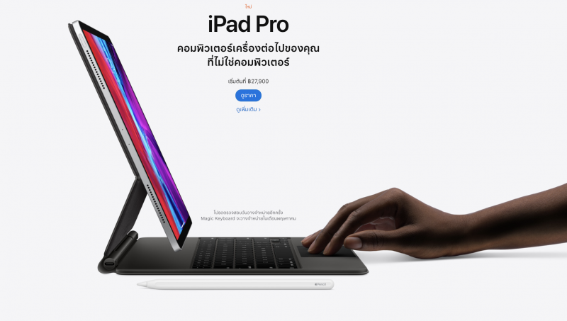 - Magic Keyboard สำหรับ iPad Pro จะวางจำหน่ายในเดือนพฤษภาคมในราคา 4,490 บาท สำหรับ iPad Pro รุ่น 11 นิ้ว และ 6,590 บาท สำหรับ iPad Pro รุ่น 12.9 นิ้ว โดยมีรูปแบบการจัดวางปุ่มให้เลือกมากกว่า 30 ภาษา เช่น จีนตัวย่อ ฝรั่งเศส เยอรมัน ญี่ปุ่น และสเปน