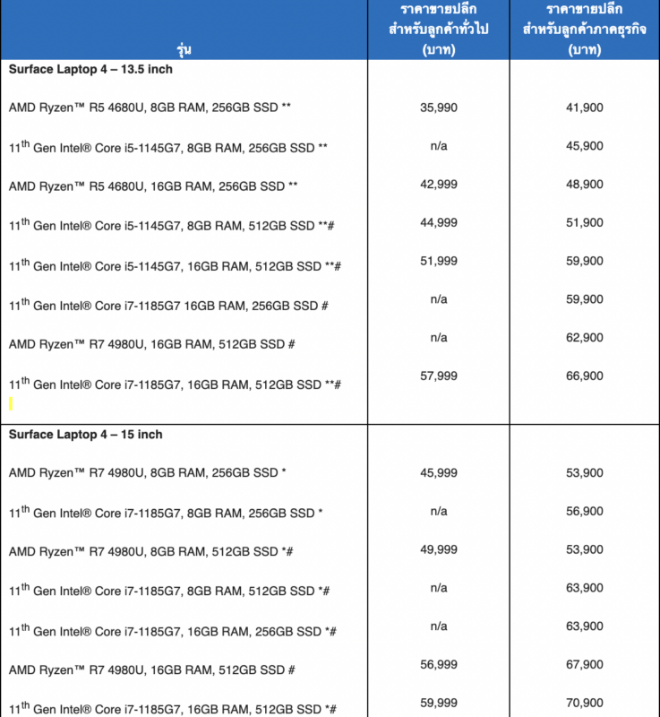 ราคาของ Surface Laptop 4 รุ่นล่าสุด ที่พร้อมวางจำหน่ายในประเทศไทย มีดังต่อไปนี้